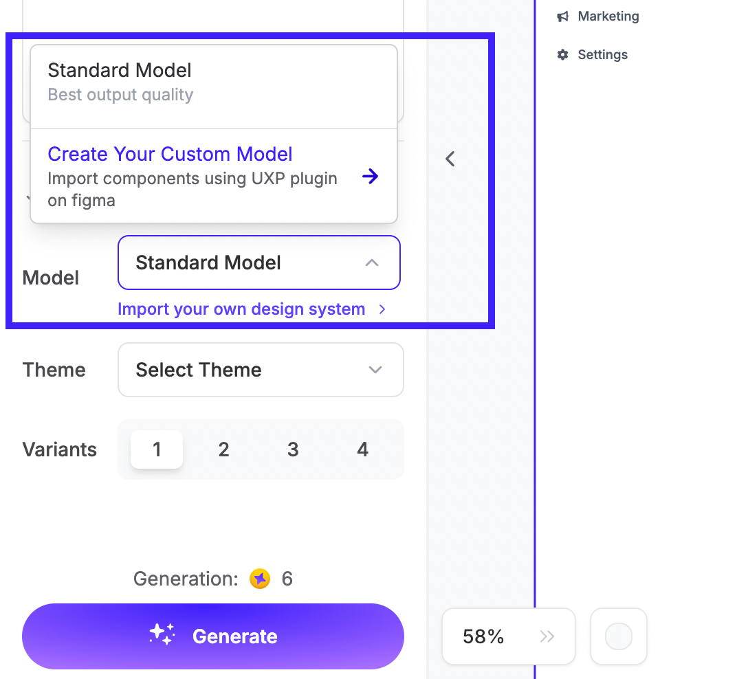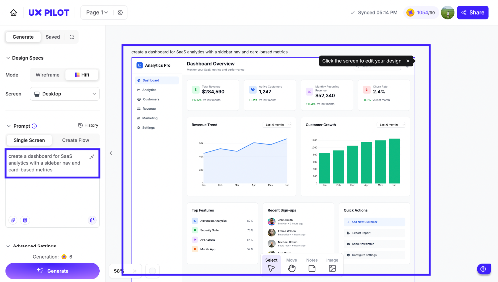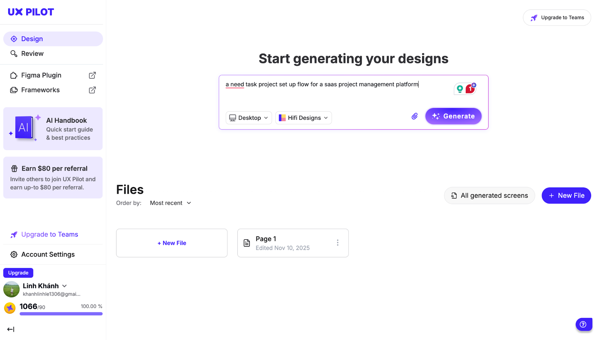 While Anima converts existing Figma files into code, UXPilot creates the designs themselves from text prompts. You describe what you need, and it generates complete UI layouts with proper component structure and visual hierarchy. This cuts out hours of manual design work when you're starting from zero.
