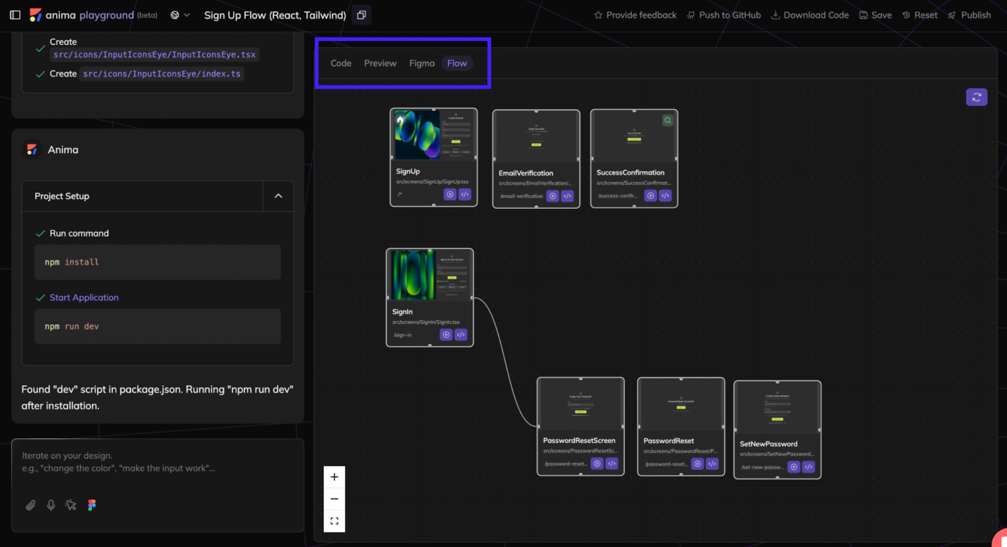 In Anima AI, you can both design and code at the same time. It stitches a Code panel, a live Preview, a Figma, and a flow panel into one playground so you can iterate visually and in code without hopping between tools.