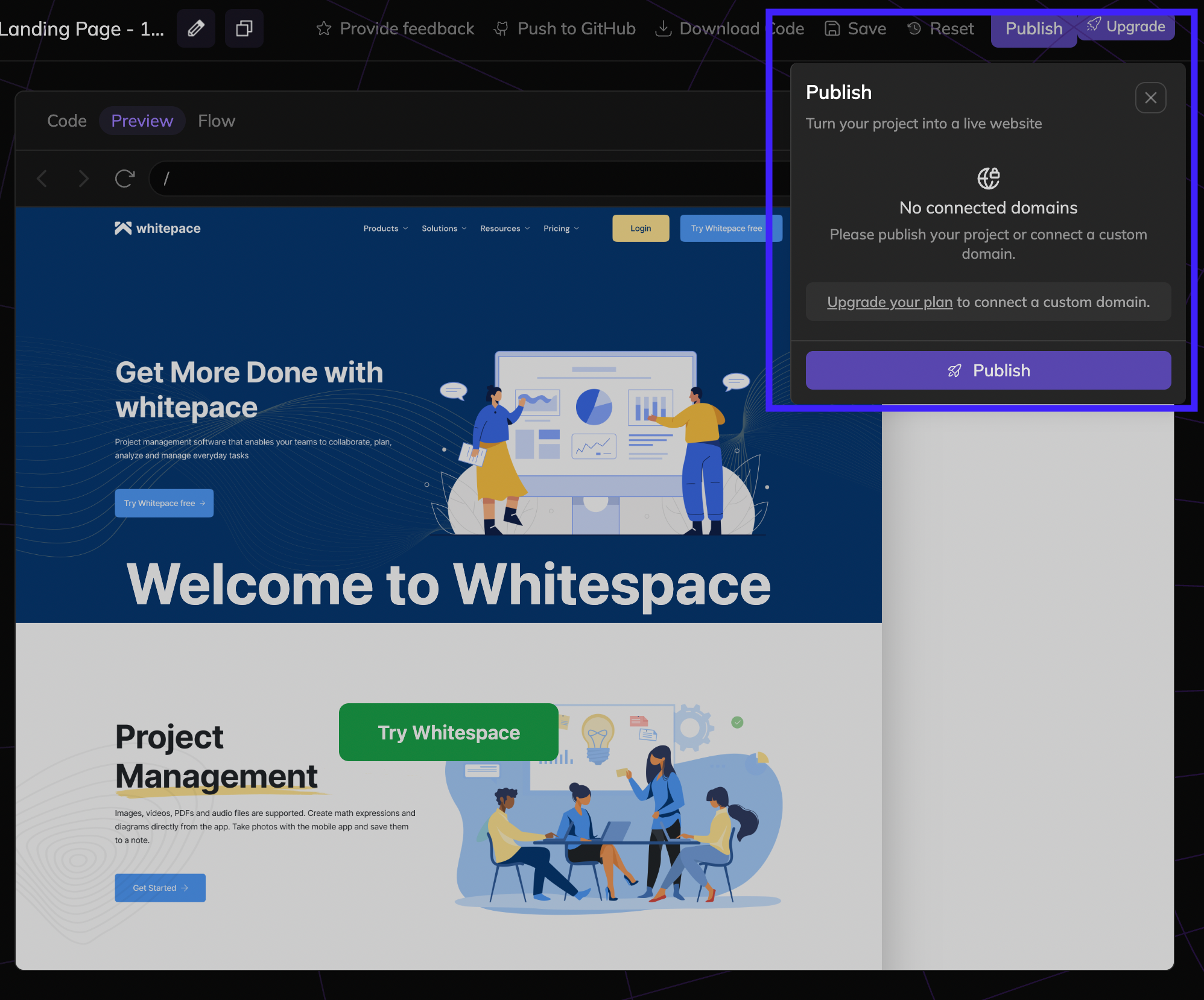 From here, you can iterate using the chat assistant, make direct code edits, export to GitHub, or download the project for local development. Your entire design-to-code workflow happens in one continuous session.