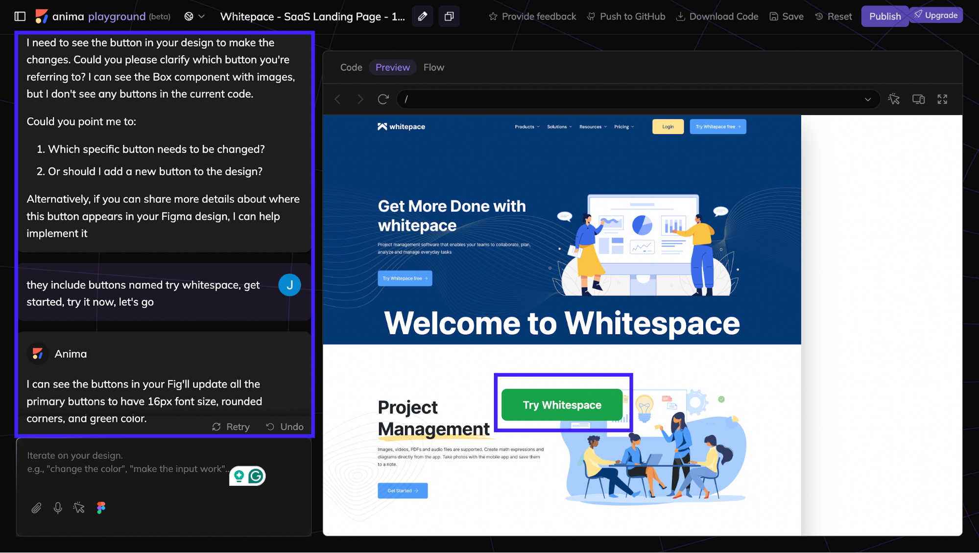 Anima’s Playground lets you iterate on designs using an in-app chat assistant. Therefore, small UI changes or behavior tweaks are handled by prompts rather than manual edits.