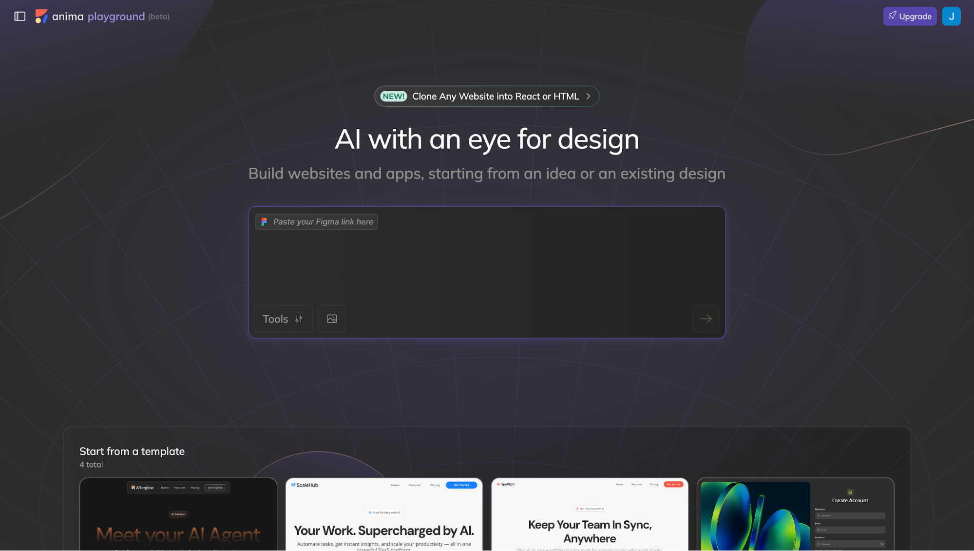 This is your starting point for creating or editing projects in Anima. The playground is where you'll write prompts, import designs, or upload references before going into the actual building process.