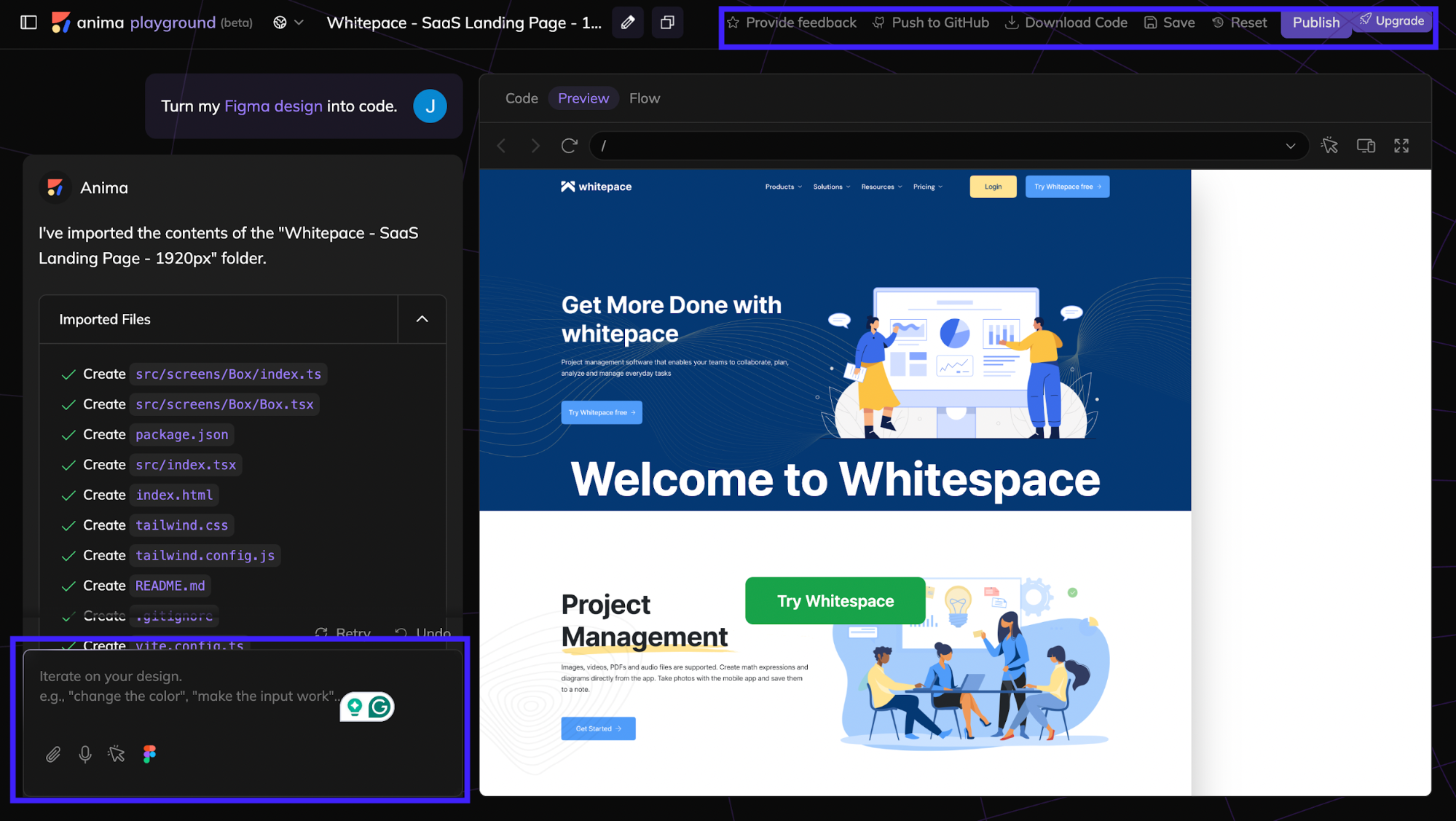 That efficiency extends into collaboration workflows as well. Anima AI's shared workspace lets designers and developers preview, iterate, and deploy from one interface.