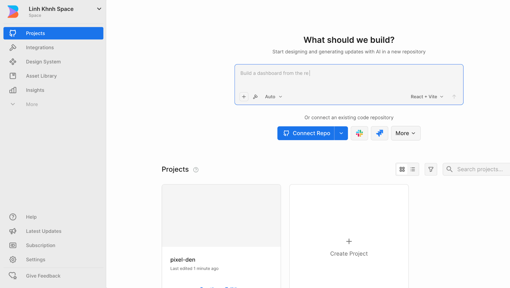 Real-time code update and export — edits made via chat are reflected in the live preview and the project’s codebase immediately. Users can continue editing files, download production-ready React/HTML, or push to a repo without leaving the dashboard.