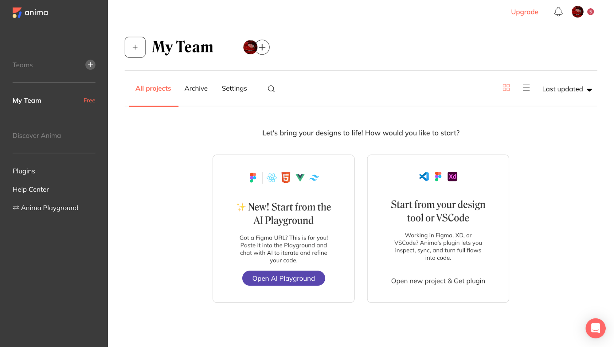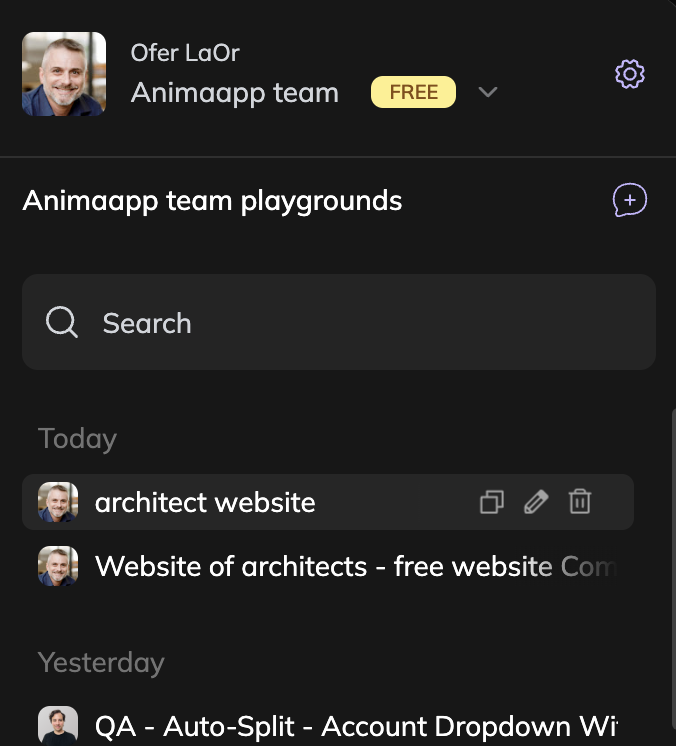 In Anima, each Playground acts as a self-contained workspace where teams can manage their projects, collaborate, and experiment. These workspaces function as the central hub for everything built in the platform, from UI exploration to production-ready prototypes.