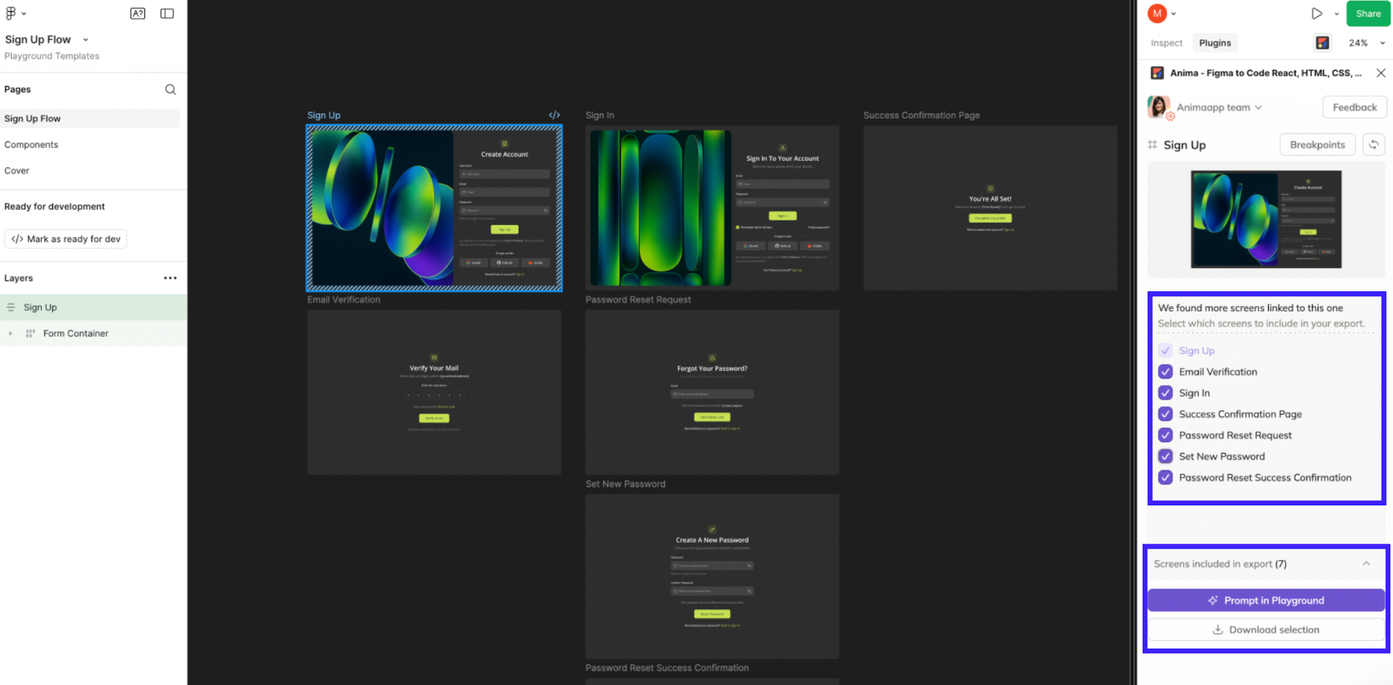 If you're importing a multi-screen flow, you can pick which frames to include before clicking "Prompt in Playground". The prototype links you created in Figma will automatically work in the generated code. Once loaded, your design is immediately translated into code and visible in the live preview panel.
