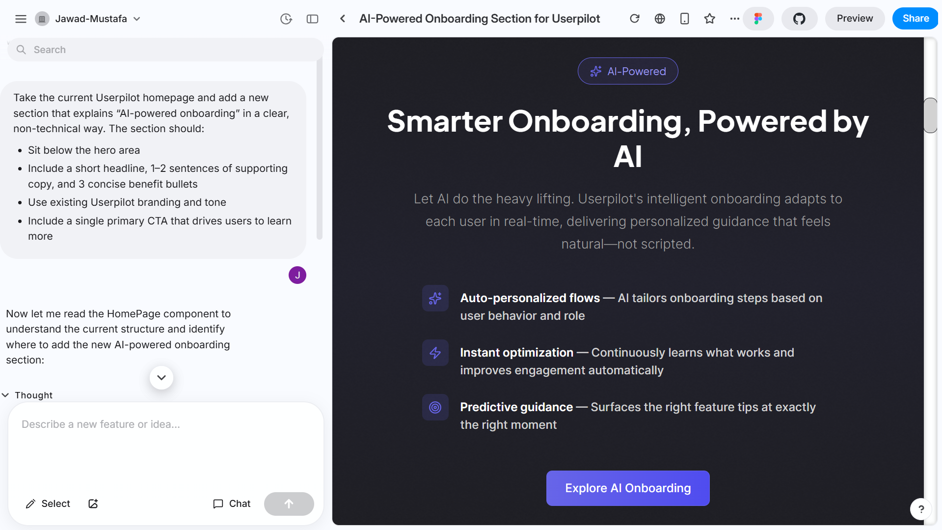 I tested it on the Userpilot homepage. Alloy captured the page as is, a process that took about a minute, though this really depends on how long the page is and how many elements it includes. Another capture took over five minutes. Once in the chatbot, I prompted the tool to add a section below the hero, with specific instructions on what it should include.