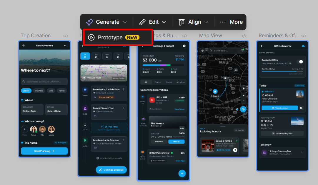 The most useful AI feature for prototyping is Add interactions. You select a group of screens you want to connect, and Figma automatically links them into a basic navigation flow. From there, you can review each generated flow individually and decide whether to keep it or remove it.
