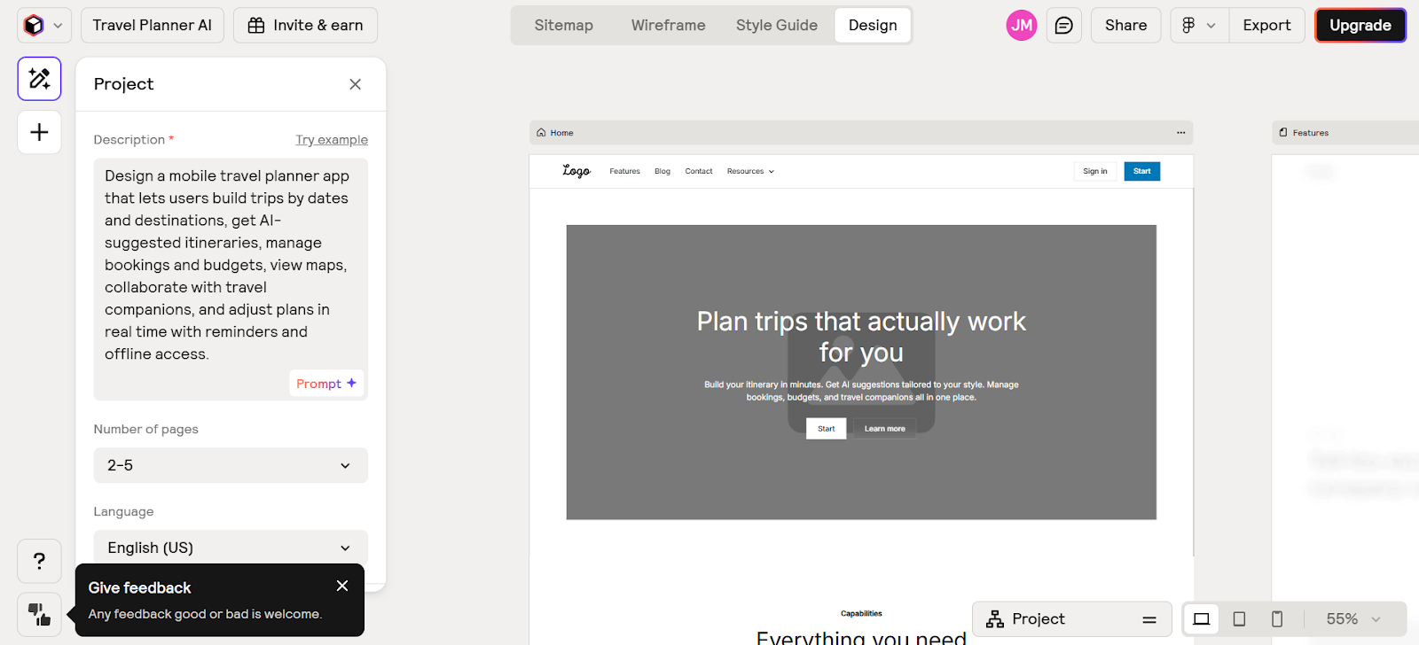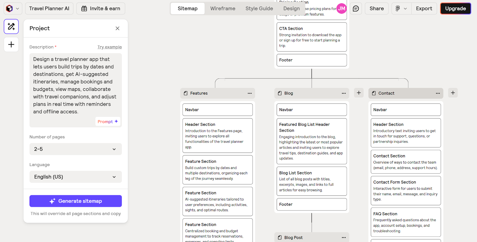 I used the same example here for a travel planning app. My simplest take on what it generated would be, it's okayish. Nothing that blows you away, it has a template-like feel, and you don't get high-fidelity prototypes, but Relume’s output generally does what you ask of it.
