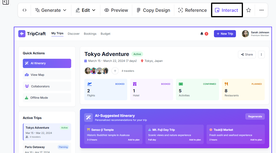 To test how a prototype behaves, select any generated screen and click the Interact button. This lets you click through buttons, test user flows, and see how the app actually performs.