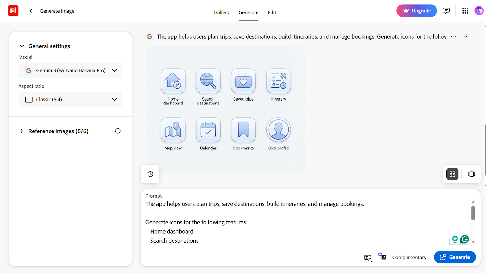 Since it’s not built for full UI design, I decided to have it generate a few icons for my travel app instead. It delivered as requested, though the style felt a bit stuck in 2010–Facebook territory. But that's something you can quickly rectify with a follow-up prompt.