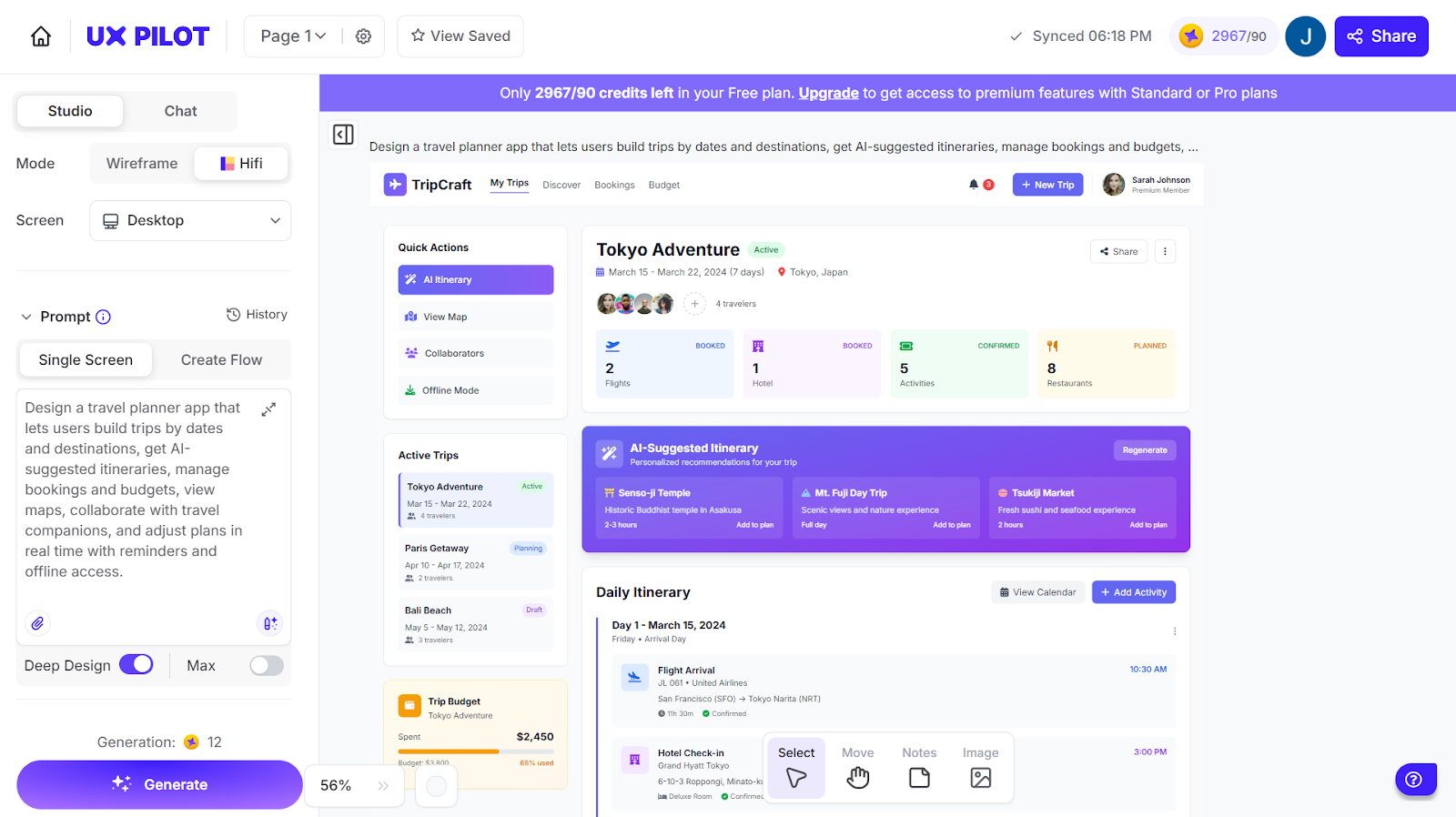 Here is an example of a screen I generated for a travel planning app.