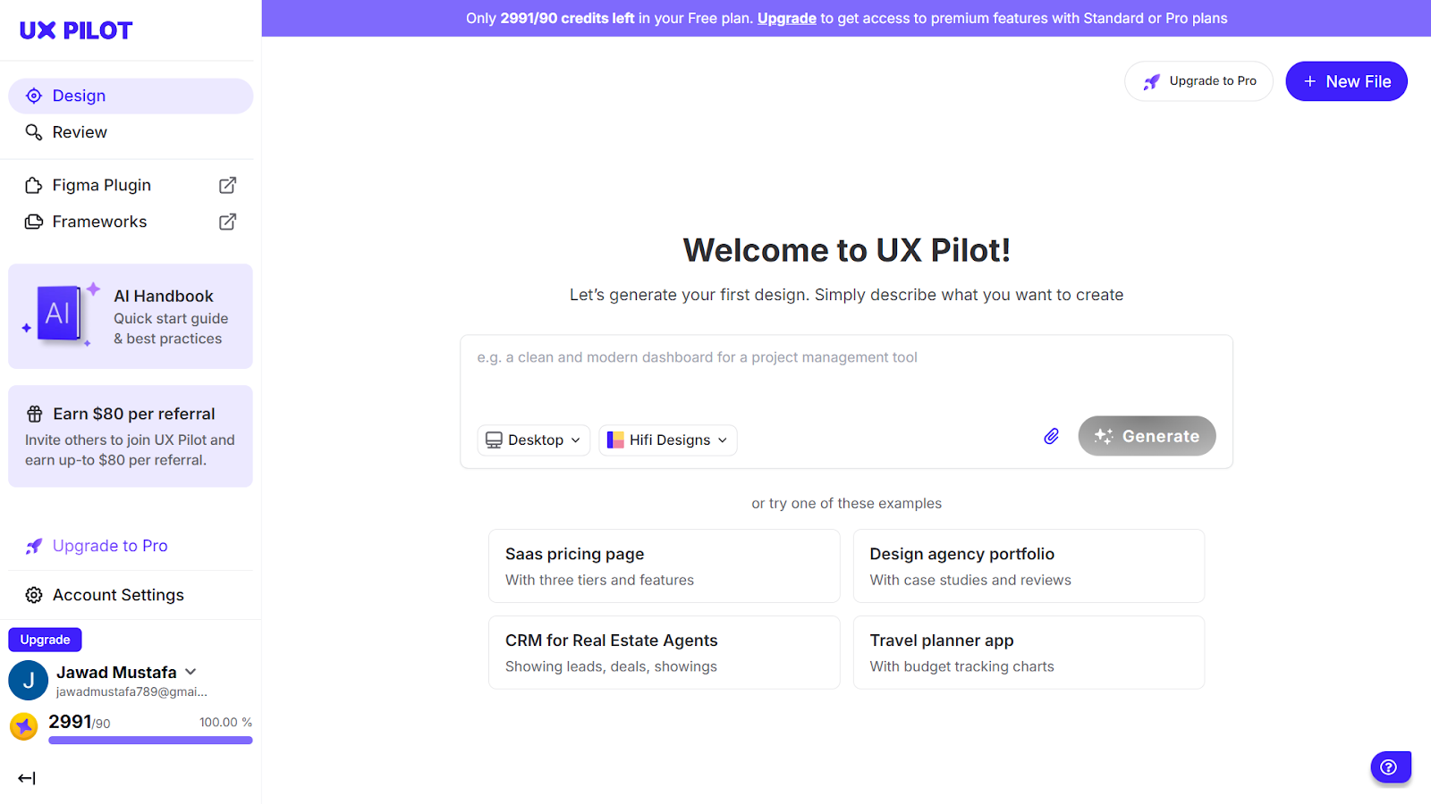 To get started with your prototype, describe what you’re looking for, whether you want a mobile or web app, then click Generate. If you have a specific design inspiration image or a doc covering guidelines, you can always attach it as a reference.