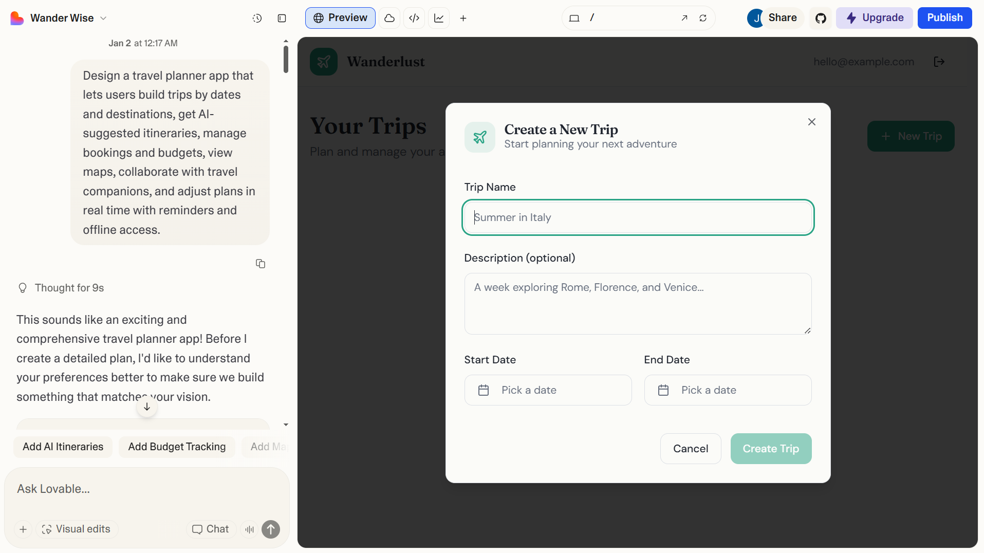 I tested it using the same travel planning app idea you might remember from the previous tools. Lovable produced a functional multi-page app that had all of my desired features added. You could add trips, save information, and move through flows.