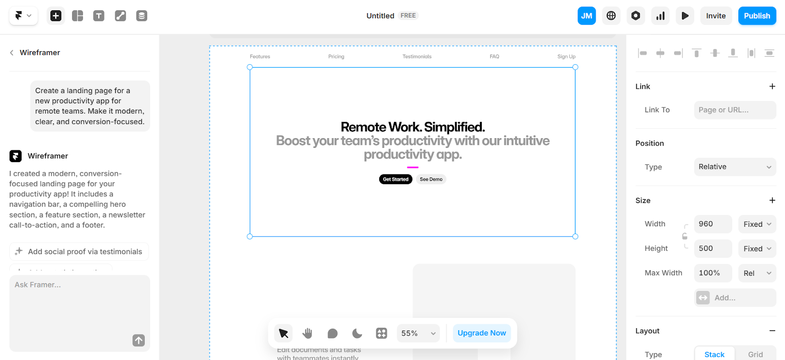 Framer works best if you have some level of technical know-how. You can start from a template or a blank canvas, and begin a new design either manually or with its AI tool.