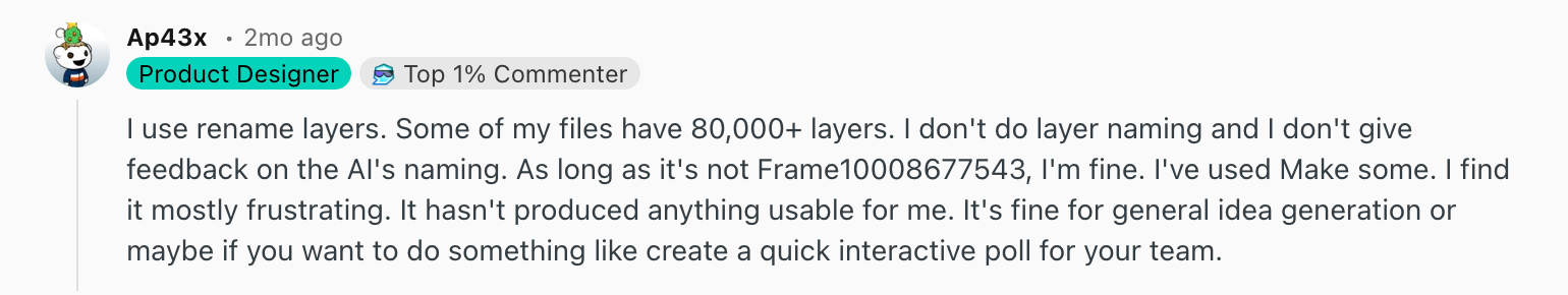 But from my observations, since it's still a beta feature, much of Figma’s AI output feels optimized for demos rather than real design work.