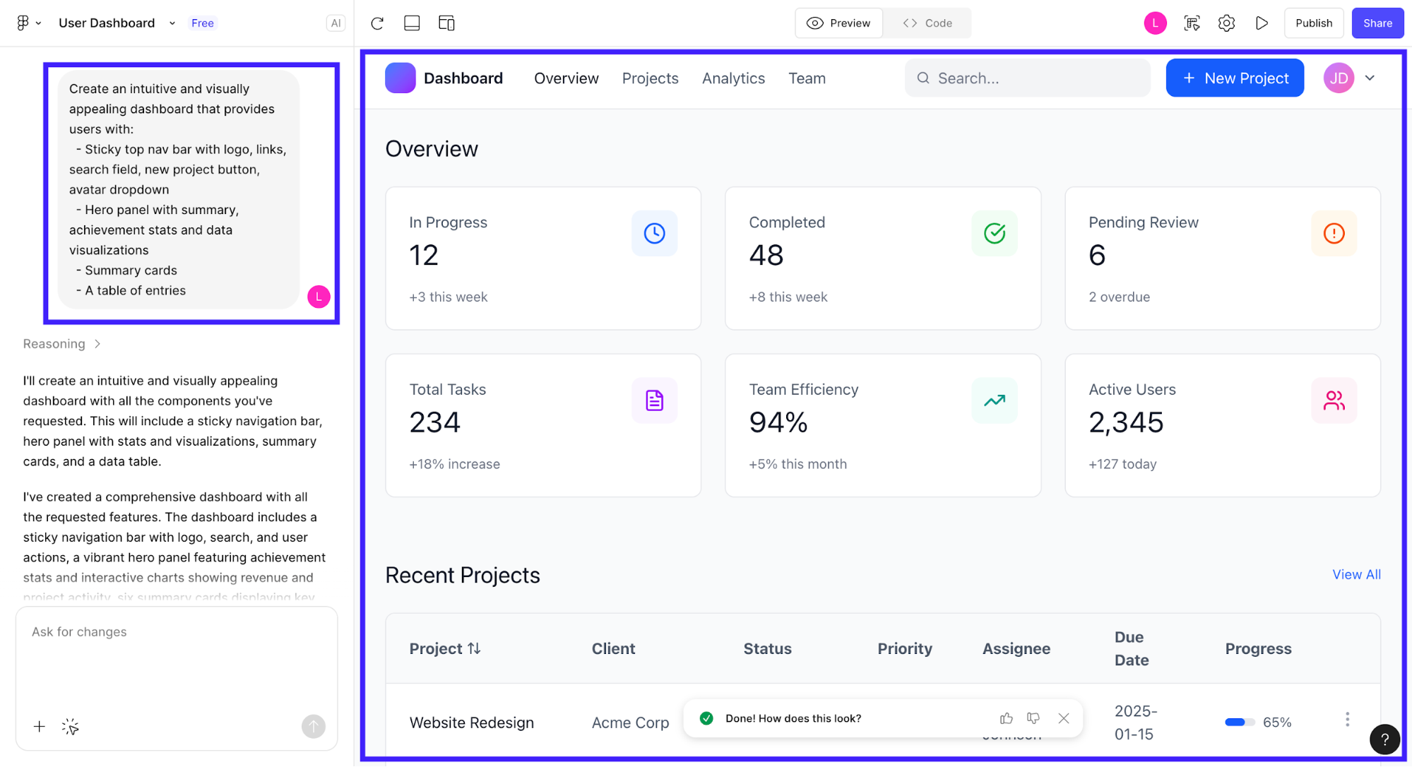 Instant UI generation from prompts: Describe the interface you want and get polished UI screens in seconds for both mobile and desktop.