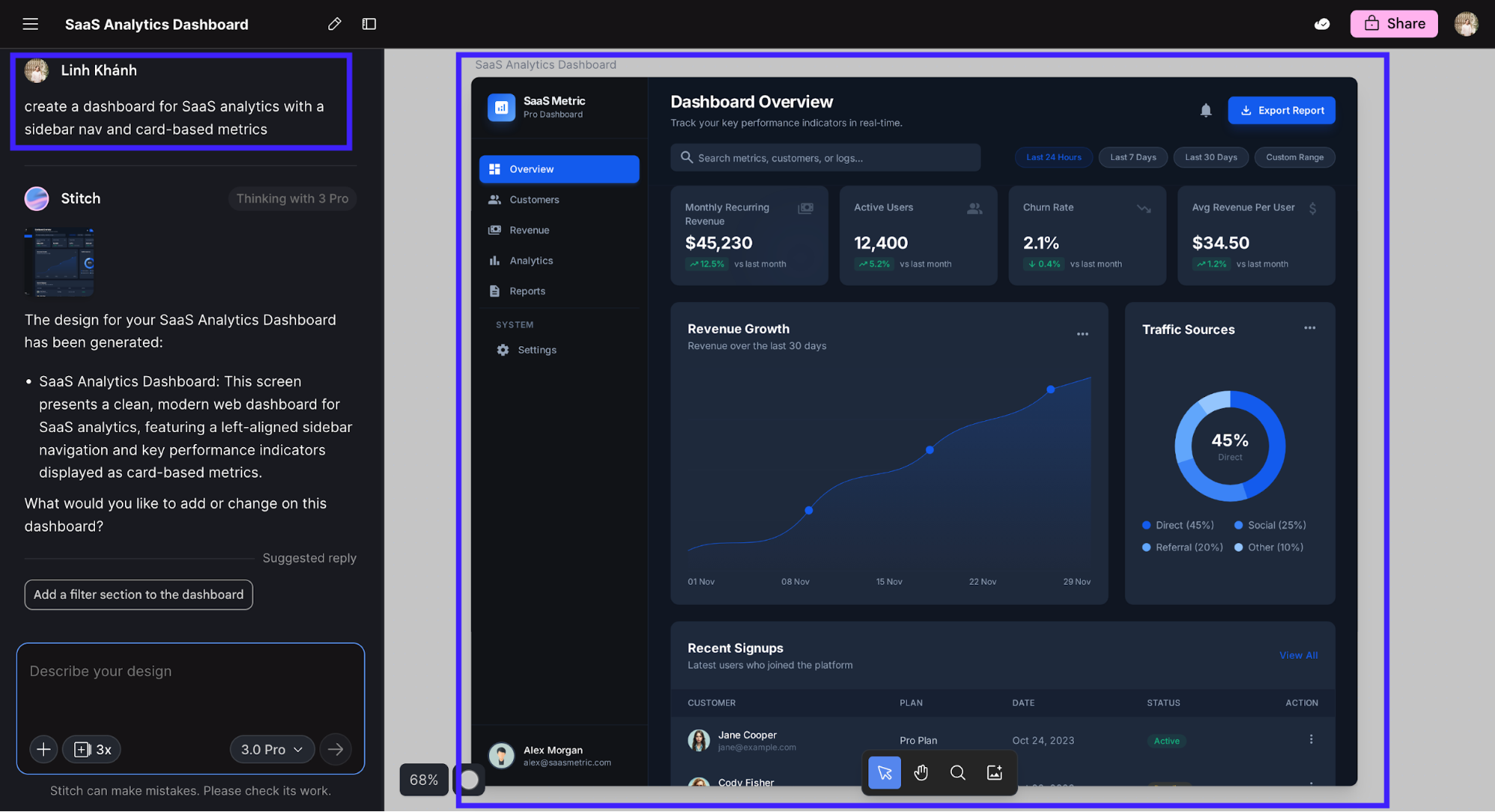 Chat-based editing: You can talk to your design to tweak components or regenerate entire screens using natural language.