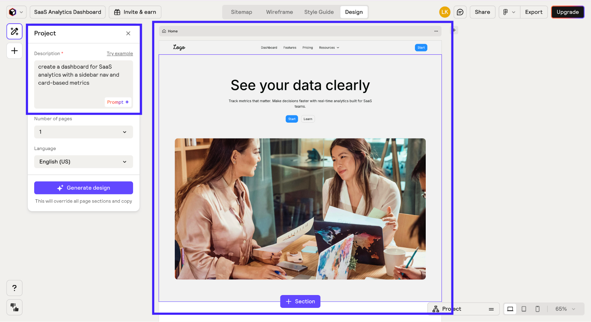 Using it is simple. You describe what you need, and the tool generates a complete sitemap, wireframes, and a style system you can export to your favorite tools.