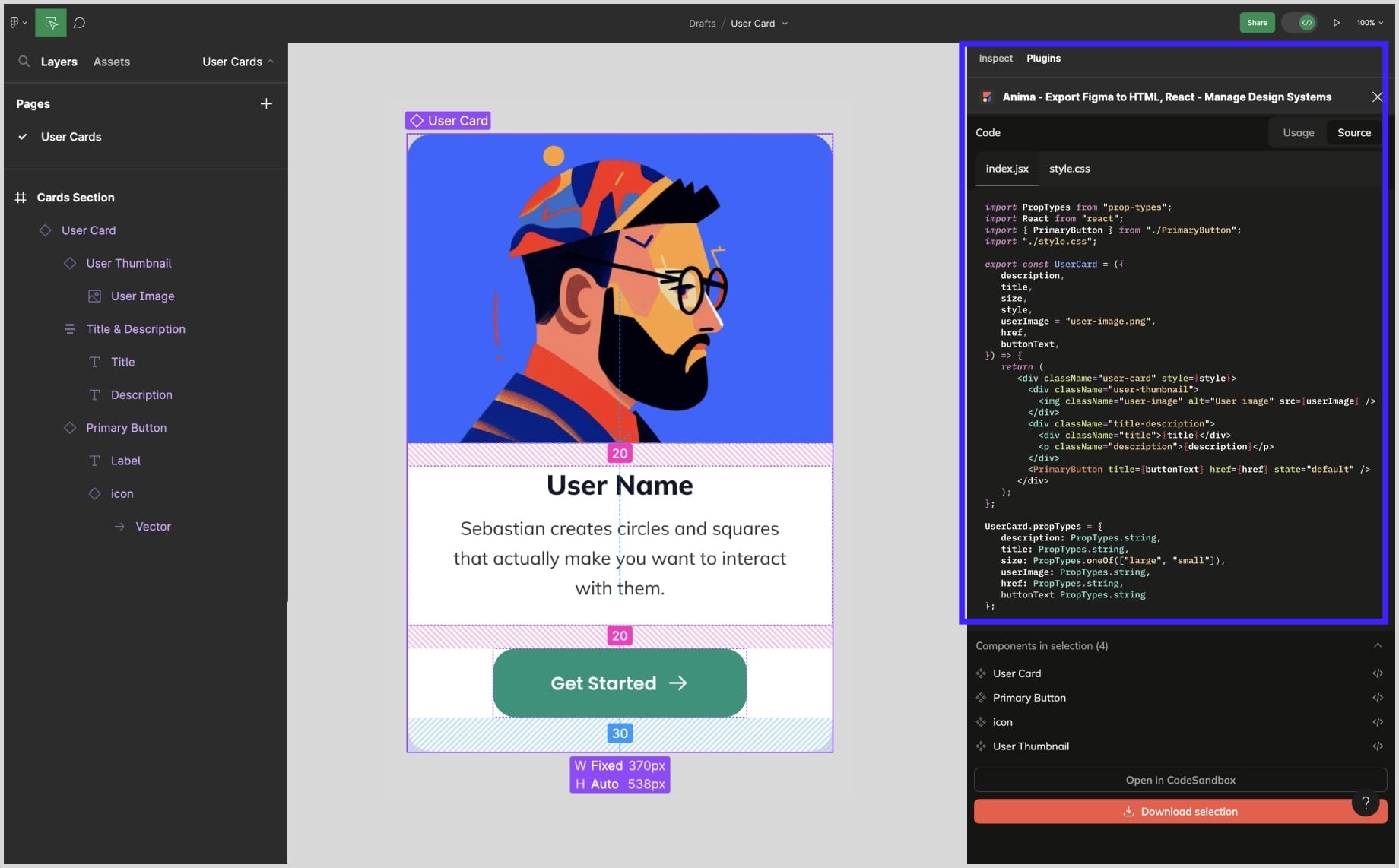 It lets you select a layer or frame in Figma, pick your target framework, and export the code or preview it in Anima’s “Playground” environment.