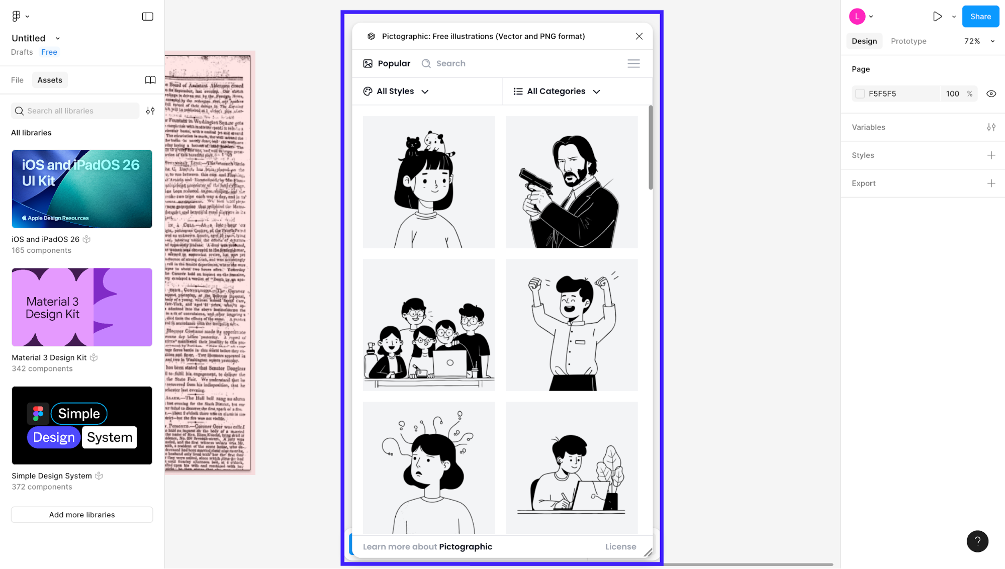When I installed Pictographic, the appeal was obvious: a built-in library of illustrations (vector + PNG) you can drop into your Figma canvases. Instead of sourcing art externally and importing messy assets, you get to view images and illustrator-ready visuals right inside your file.