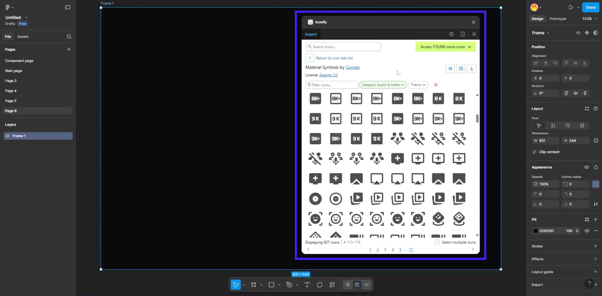 Universal icon search across collections: Iconify supports thousands of icon sets (including Material, Font Awesome, and Custom sets) and gives you a unified search inside Figma. You type a keyword, choose a style, and insert the icon.