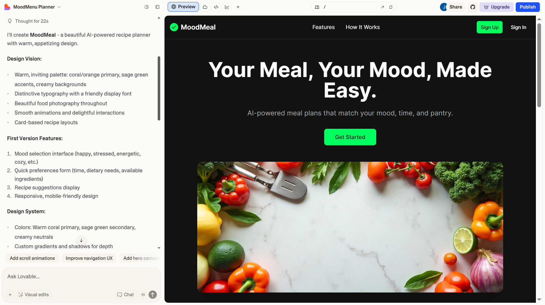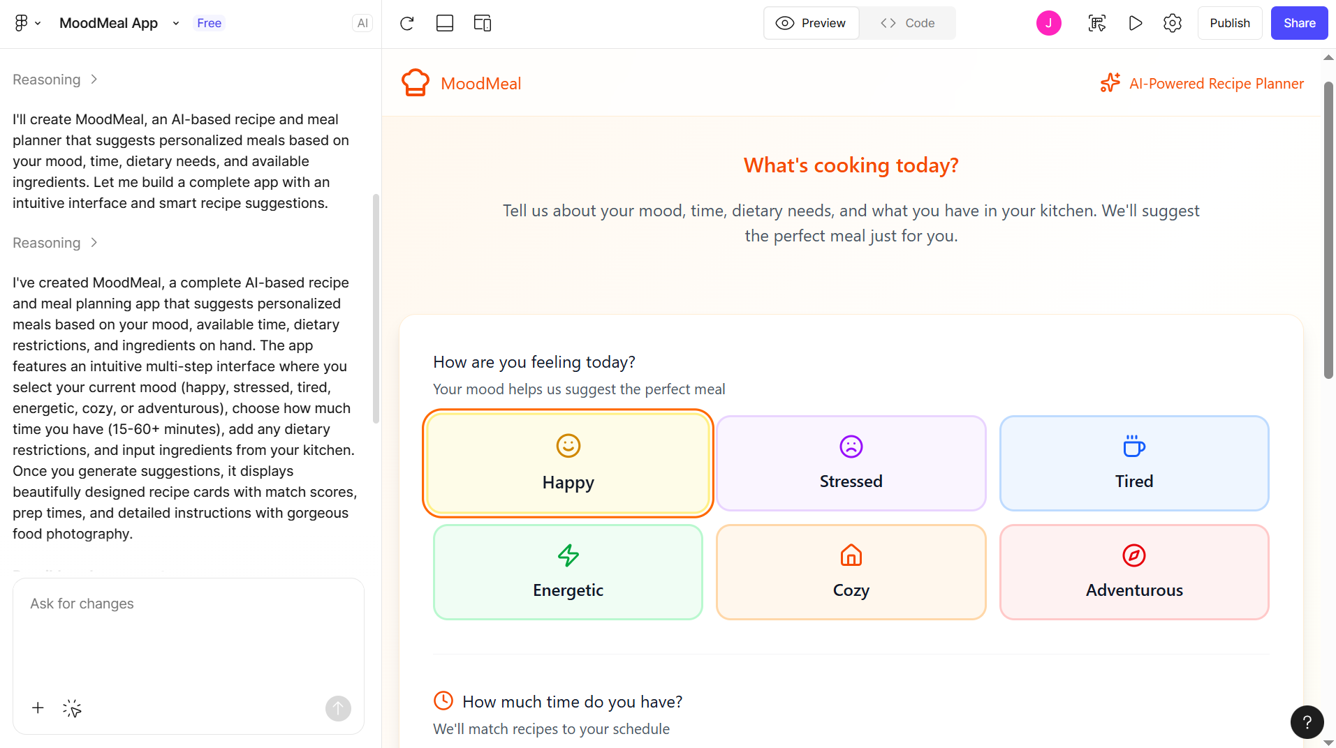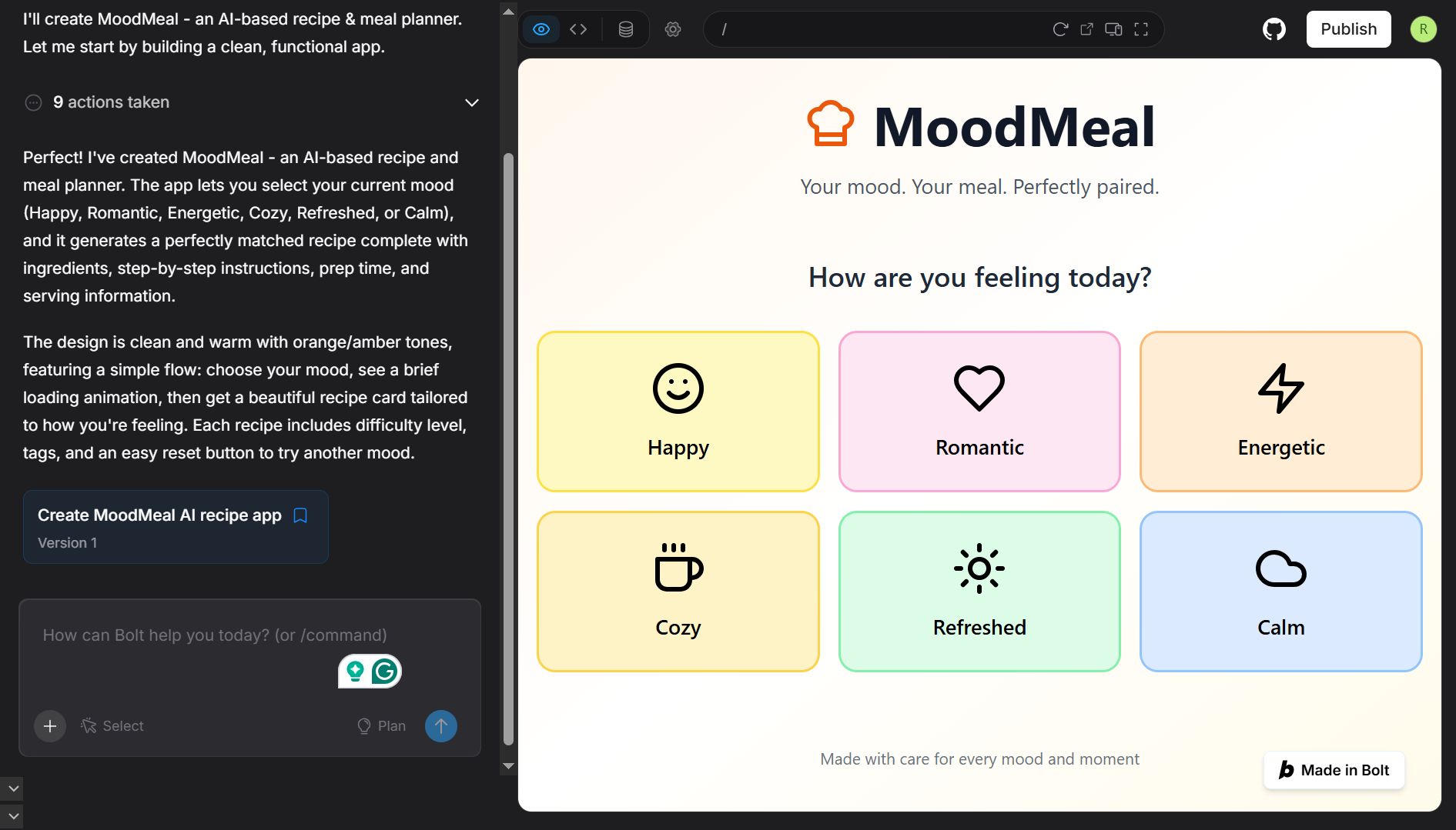 To test it, I used the same prompt as I did with the other tools on this list for a meal-planner app. Bolt delivered what I asked for, generating an app that suggests meals based on a user’s mood and available ingredients. It walks you through its product development process, showing exactly which steps it's executing at a time and the code generation process.