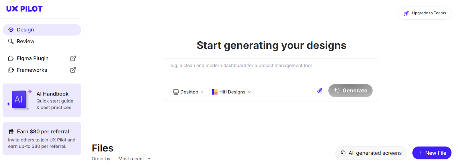 UX Pilot helps with ideation, design, and prototyping for your apps. It can generate wireframes and hi-fi designs for anything from a single screen to full user flows, and even map out your information hierarchy.