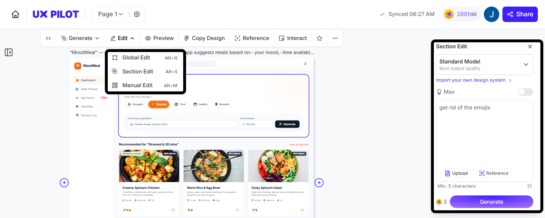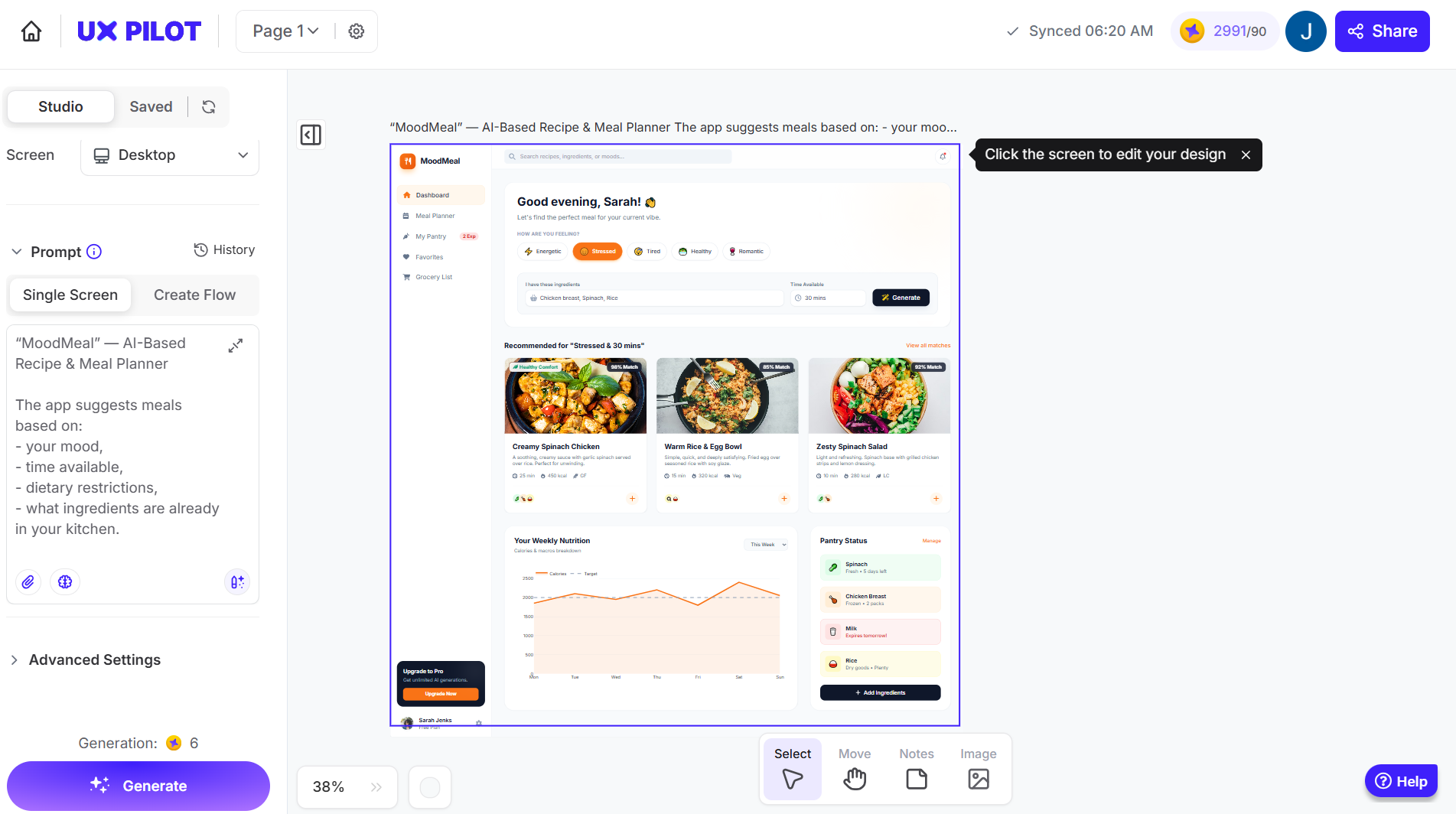 Here’s an example: I asked UX Pilot to generate a design for a meal planner app and provided a few general instructions — nothing overly granular, just enough for the AI to get the gist of what I was after. It did a more than reliable job and returned a design I could easily build on.