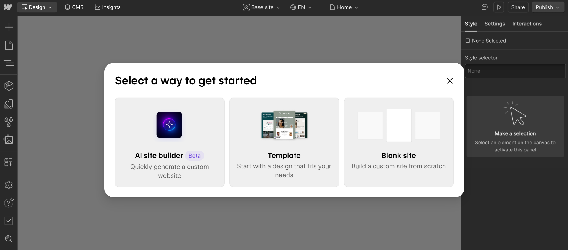 You can start off with a blank canvas, choose from pre-built templates, or get started with the Webflow AI site builder. I went with the AI option, and one thing stood out right away: compared to other vibe-coding tools like Lovable and Bolt, the initial design looked far more polished. I didn’t have to add reference images this time either.