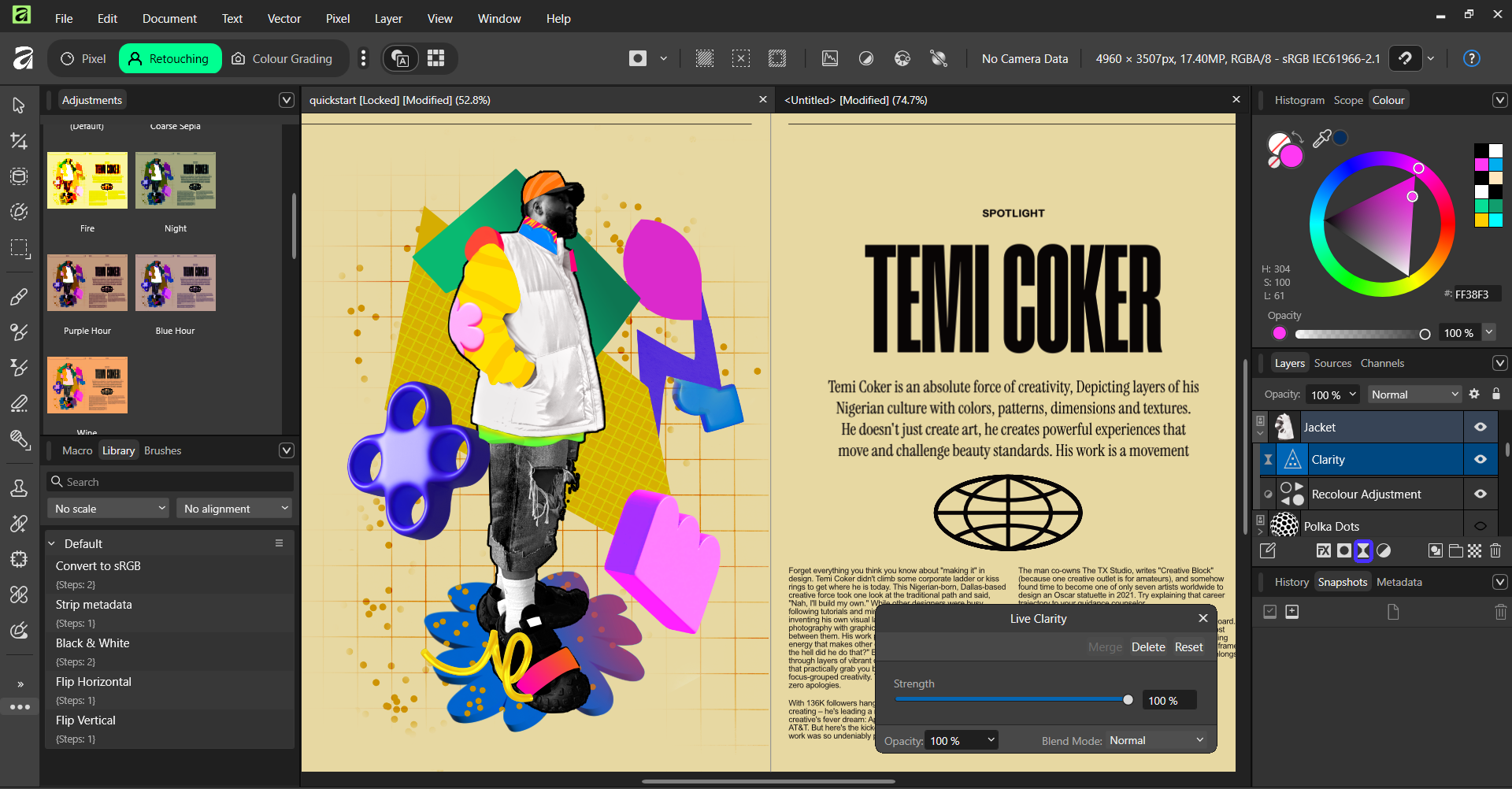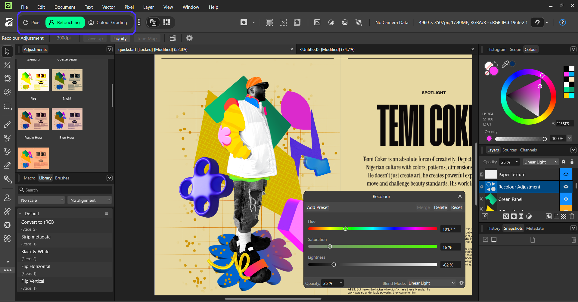 For example, I added the Pixel, Retouching, and Color Grading tools to control the design's overall color schemes more easily: