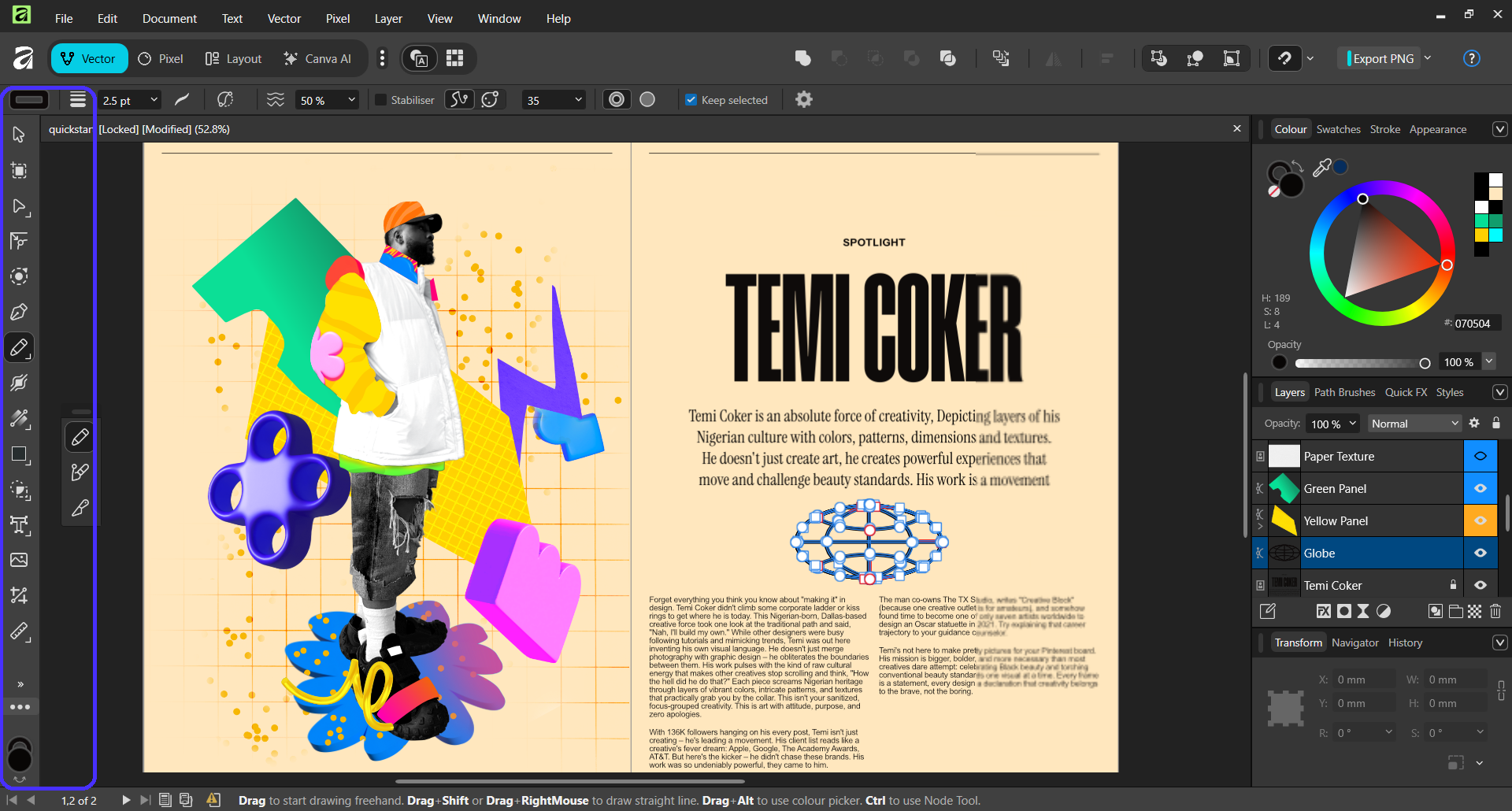 The Vector Studio includes the vector editing tools previously found under Affinity Designer.