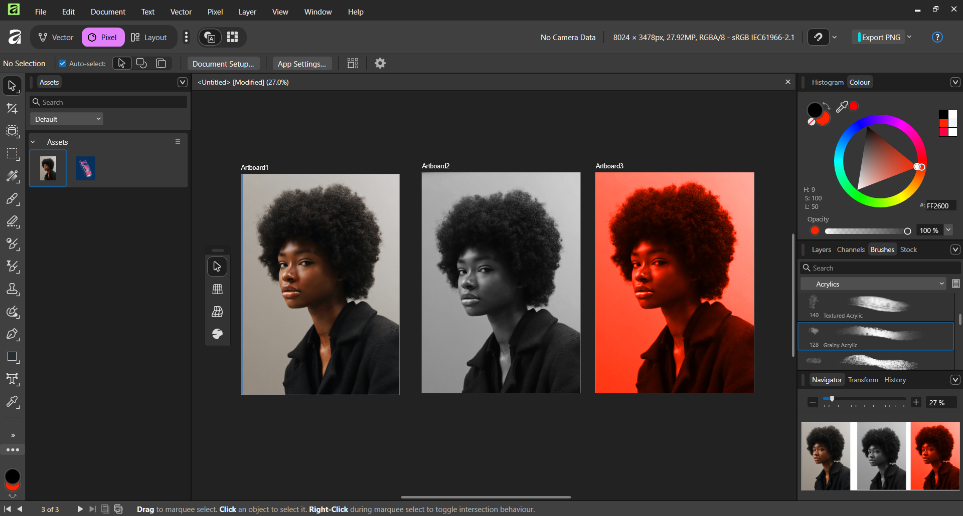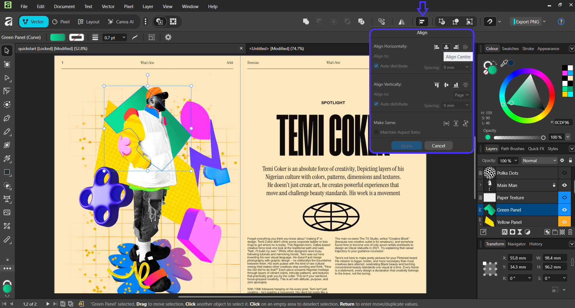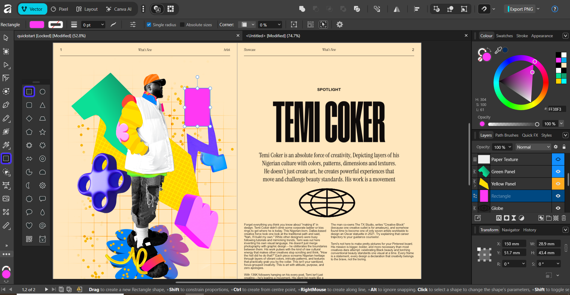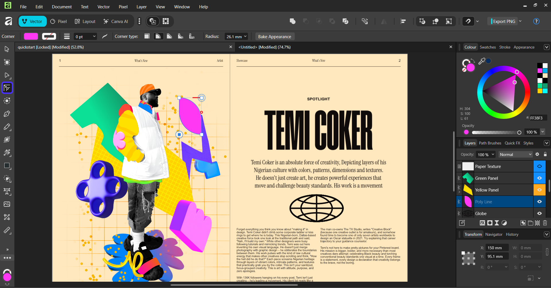 Affinity's Artboards allow you to create multiple canvases within the same document—perfect to create separate designs or variations of the same design without juggling between separate tabs.