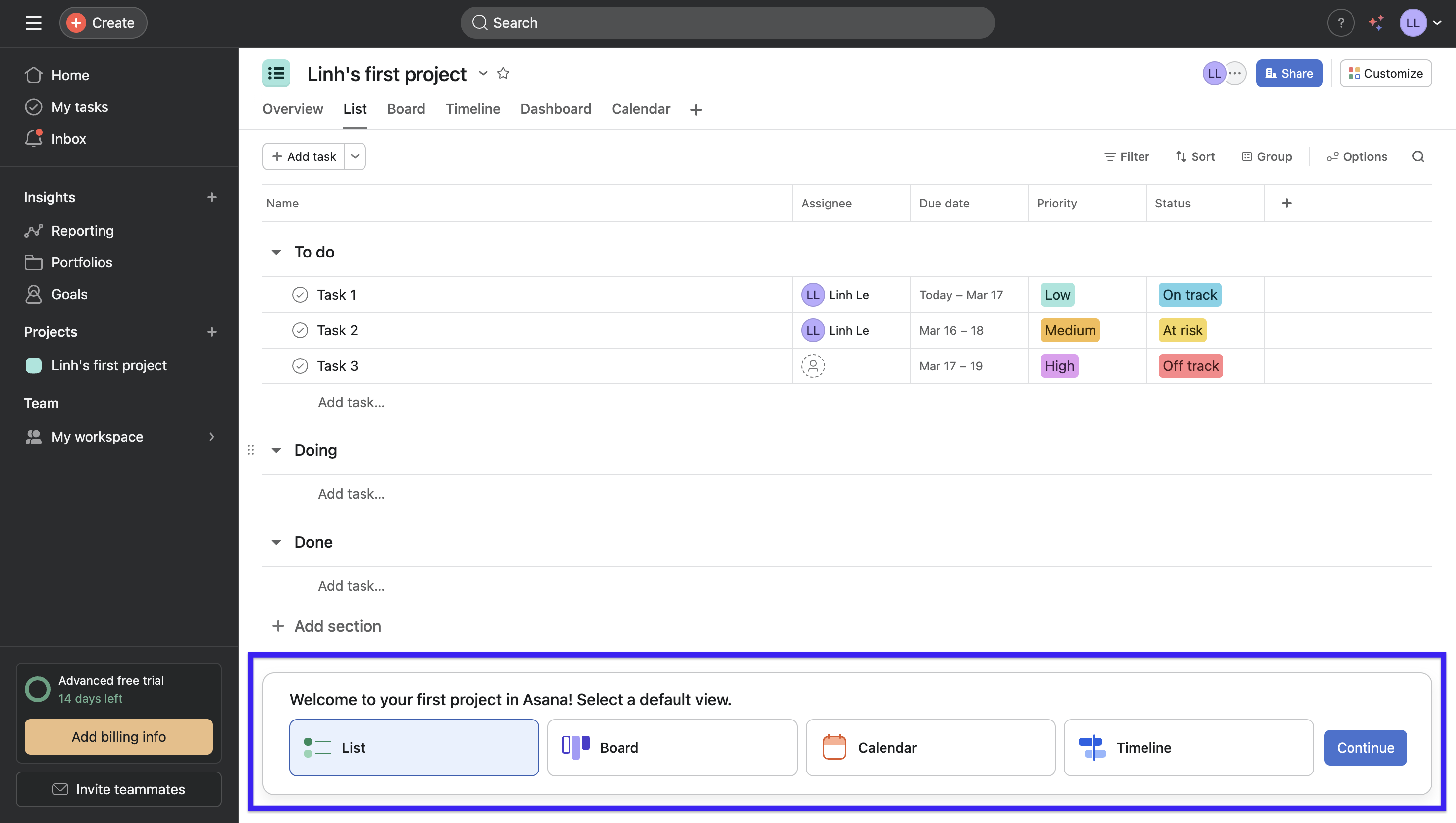 This is a common practice in SaaS, and Asana is one of the best examples I've seen of this. Rather than defaulting to tooltips or modals, they pre-populate empty screens with the tasks you said you wanted to accomplish during onboarding. They give you a clear status view with options to choose your preferred layout.