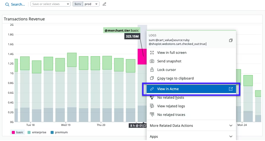 Datadog gets this right with its context links feature. Every metric widget connects to deeper views and related data sources.