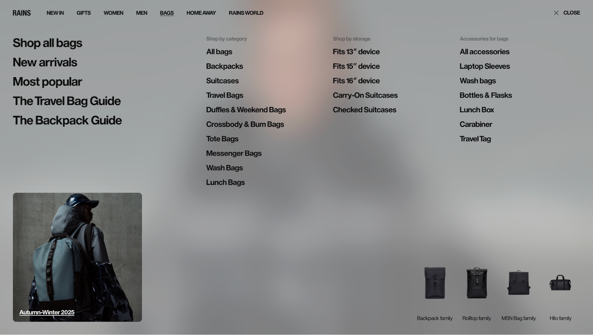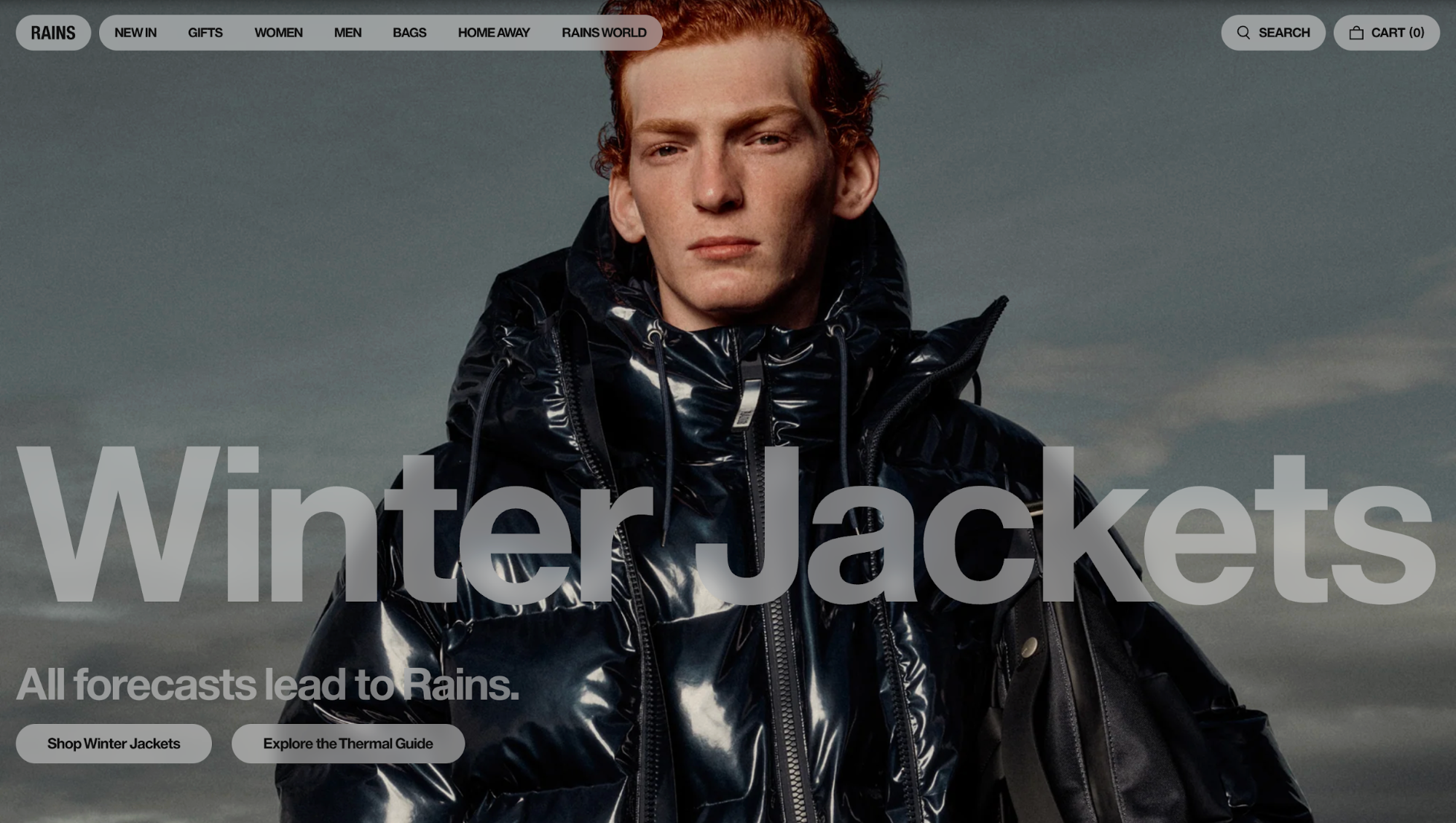 A great example of this comes from Rains, the Danish outerwear brand. Their website uses a muted, neutral color palette across large background images. The glassmorphism effect appears only where it counts: on buttons and the main navigation bar.