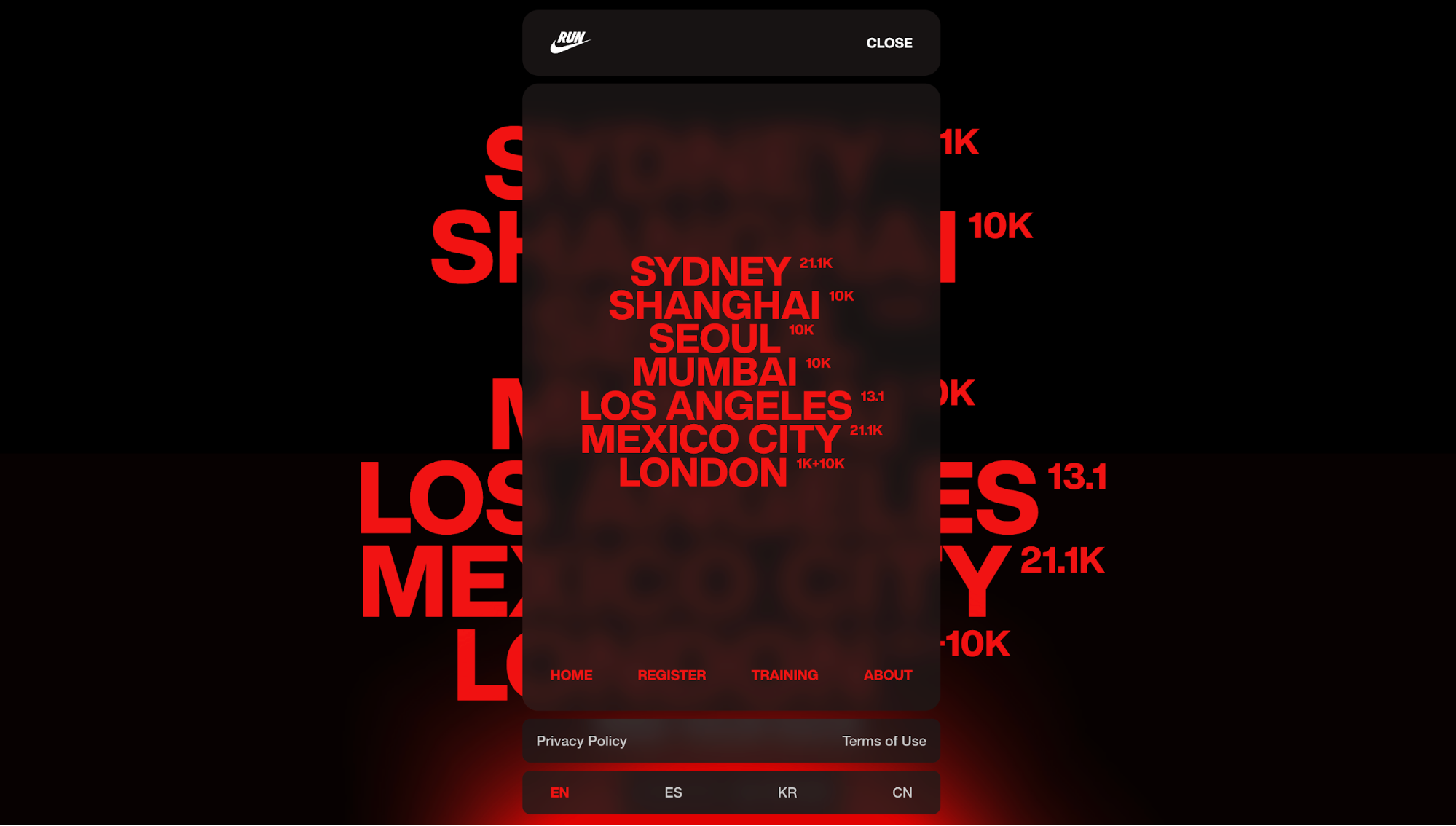 The whole experience is built around a set of running locations. That’s why you see those big red place names in the hero. They set the mood and tell you instantly what the site is about.