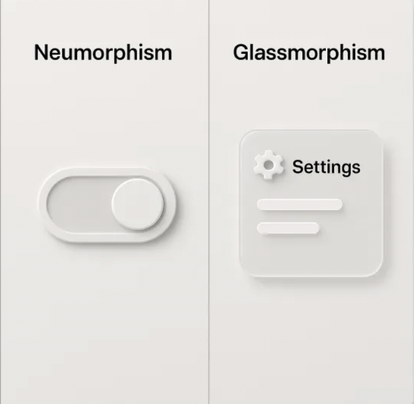 The practical difference is: Neumorphism peaked around 2019–2020 but quickly faded because designers realized it looked cool in Dribbble shots but caused real usability problems. Glassmorphism stuck around because it's more functional.