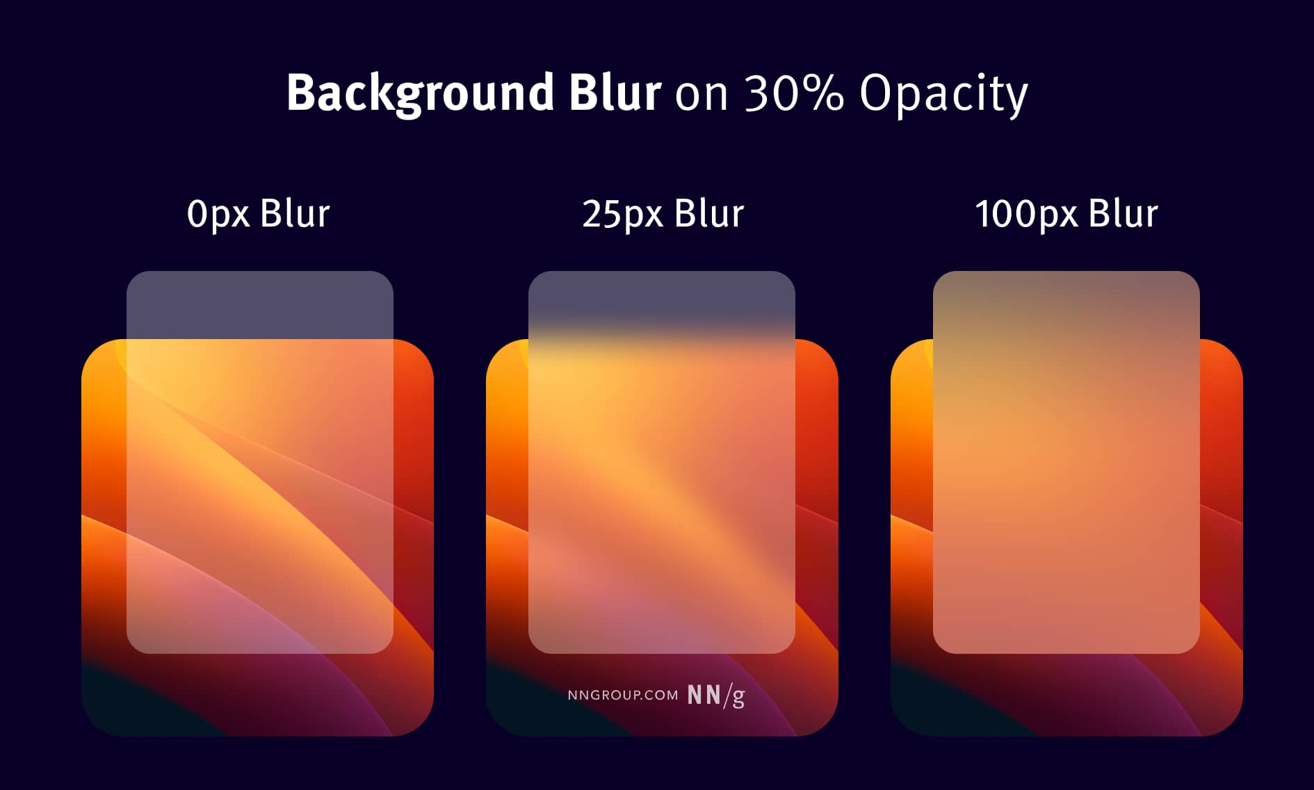 For example, all three cards below use the same 30% opacity, but the blur strength alone completely changes how readable and stable each panel feels.
