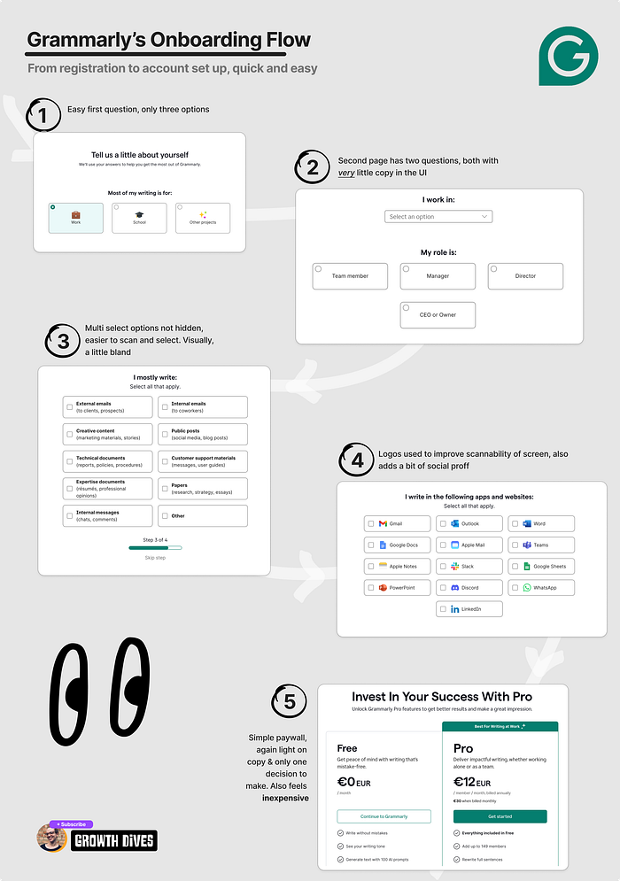 Grammarly is a great example of this. During onboarding, it asks users what type of writing they plan to do, so it can apply the right grammar and tone rules from the start.