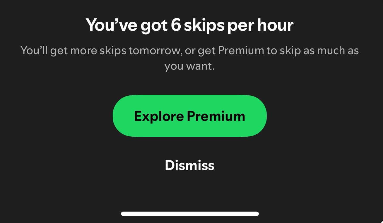 For example, Spotify uses a behavioral trigger tied to product limits. Free mobile users can skip six songs per hour. Hit that sixth skip, and Spotify prompts you to upgrade.
