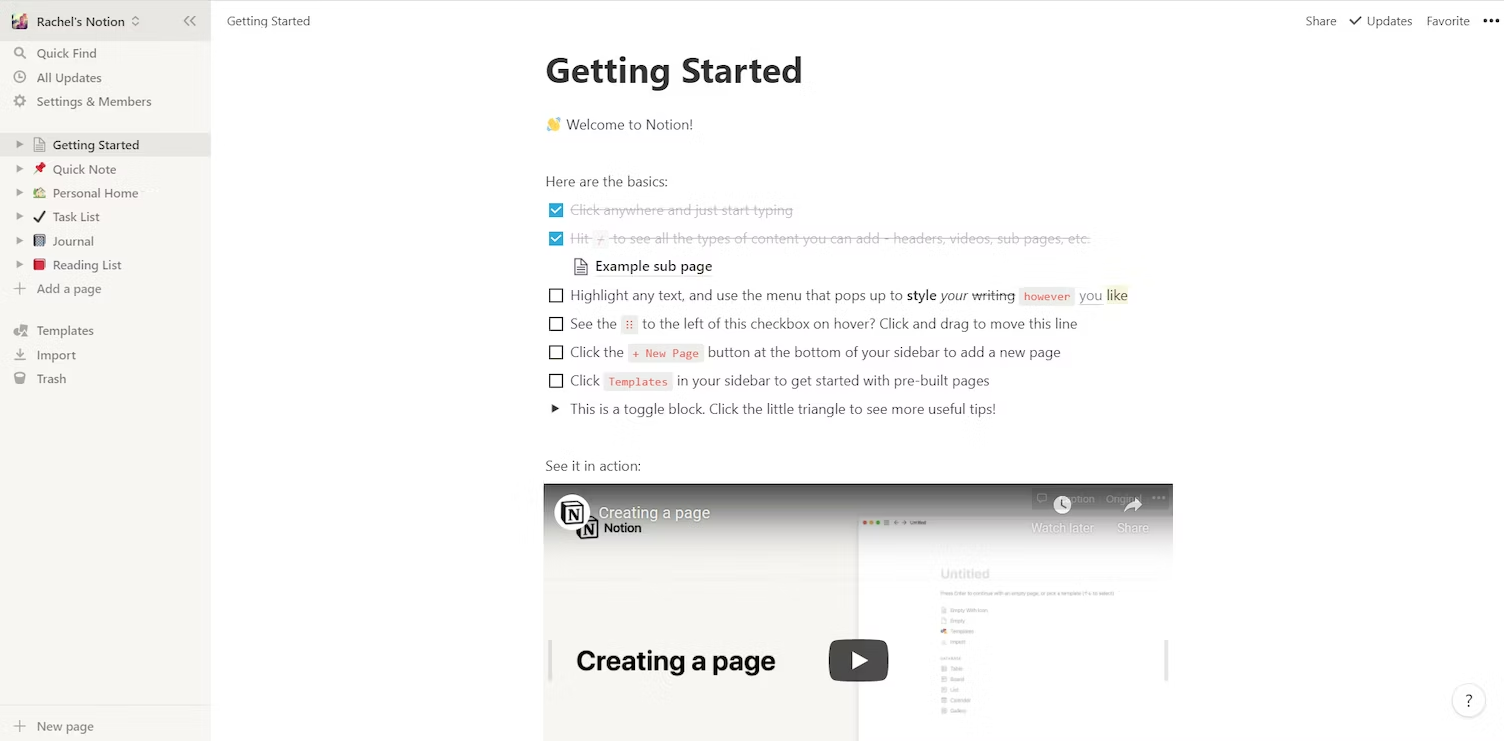 For example, Notion does this really well. New users see pages with basic text blocks, headings, and checklists.