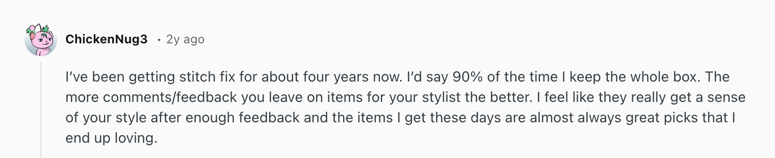 The approach clearly resonates with users. Across customer discussions and reviews, most users who stick with Stitch Fix long-term report dramatically higher satisfaction rates as the system learns their preferences.