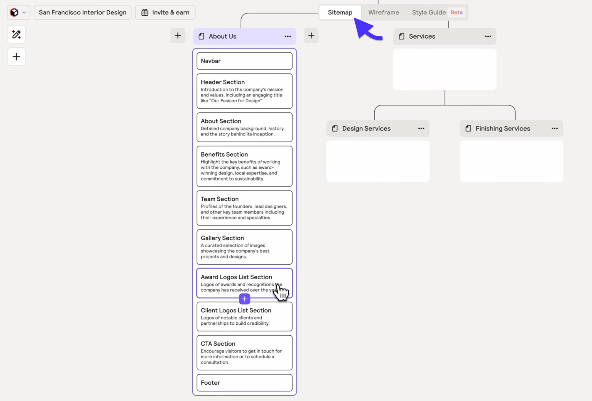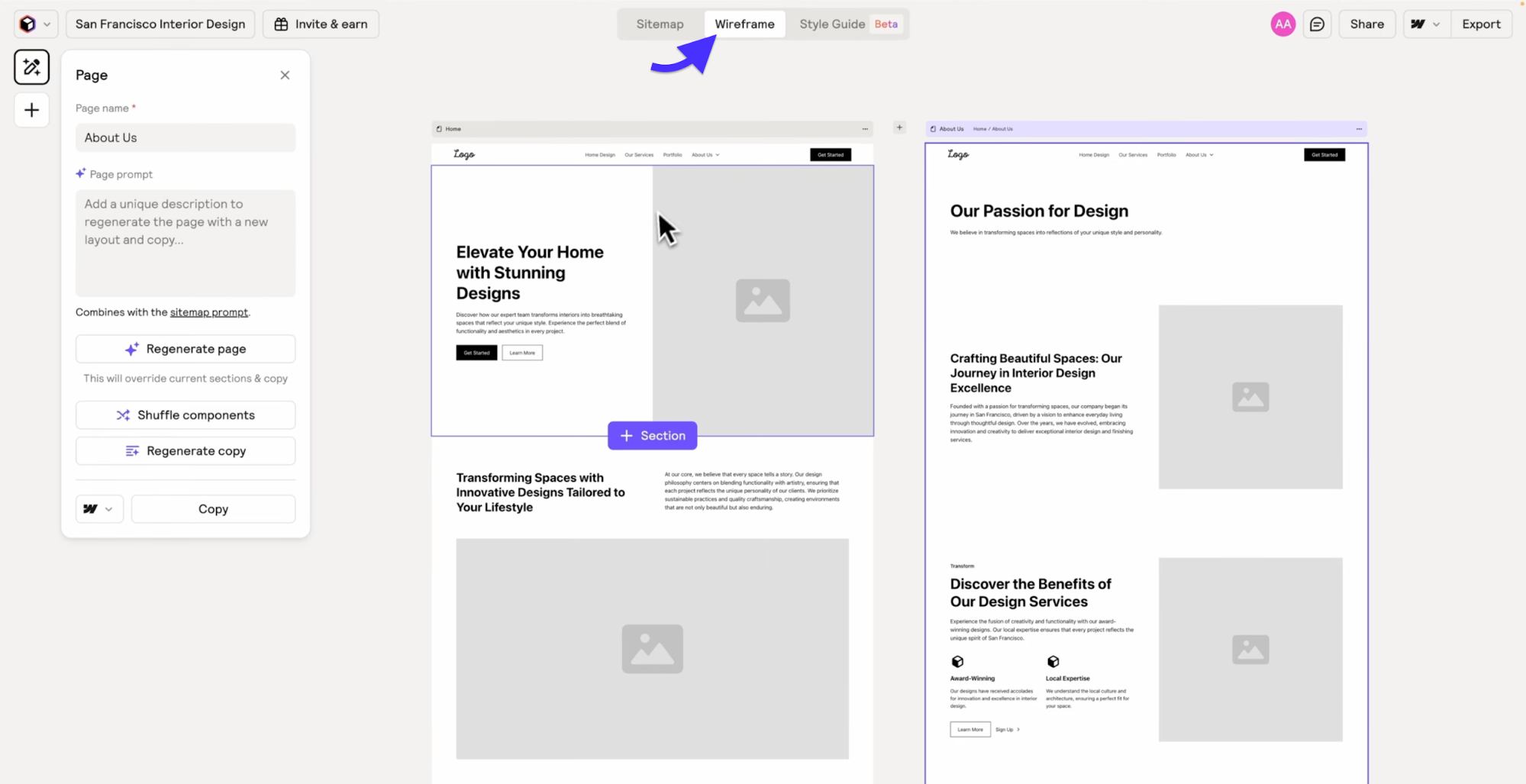 Once your sitemap feels complete, switch to the Wireframe tab. With one click, the AI transforms your sitemap into visual, low-fidelity wireframes.