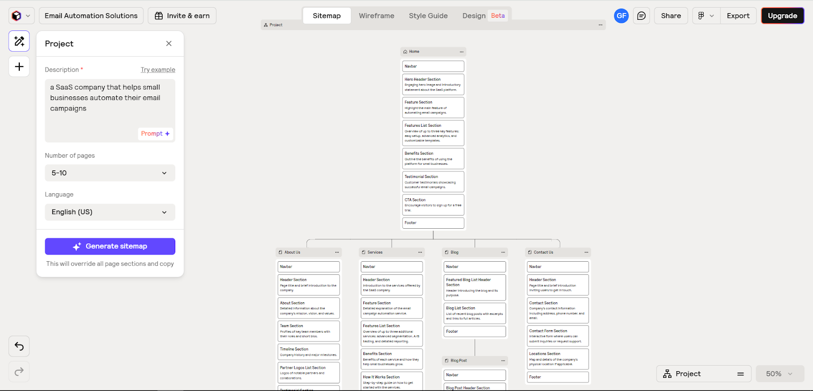 The tool instantly builds a sitemap that shows all pages, how they connect, and what sections appear under each page, including homepage sections like hero, features, testimonials, and CTAs.