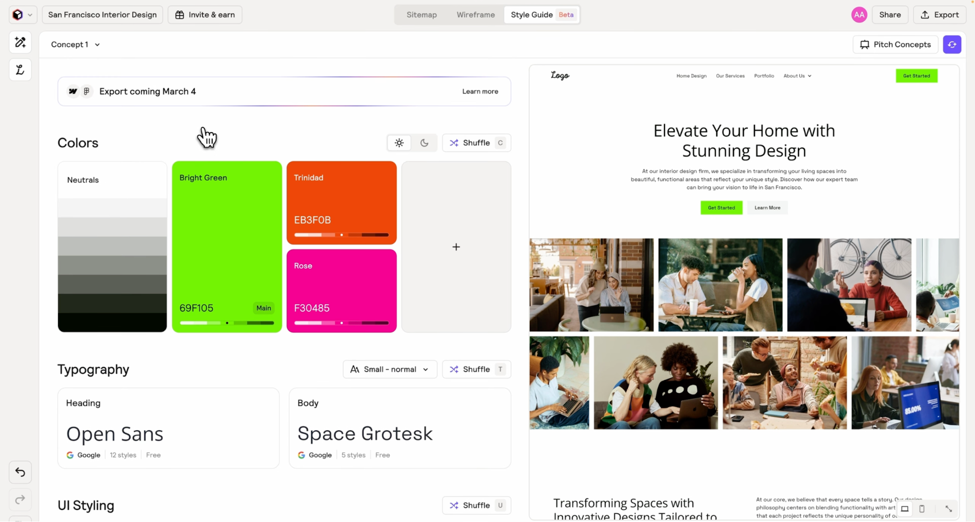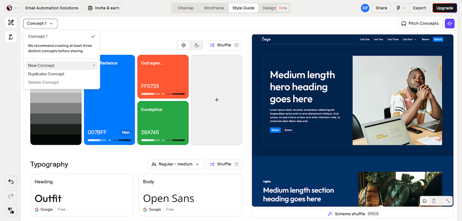 Below is an example of how your concepts appear in Relume, with customizable color palettes, typography, and layout previews:
