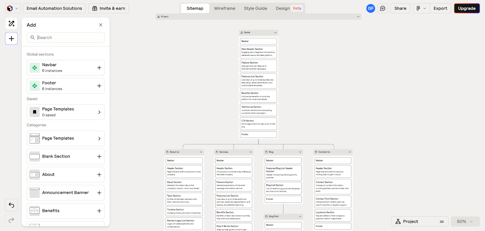 Here’s how the customization process looks in Relume. You can easily edit, move, or expand sections to shape your sitemap exactly how you want it.