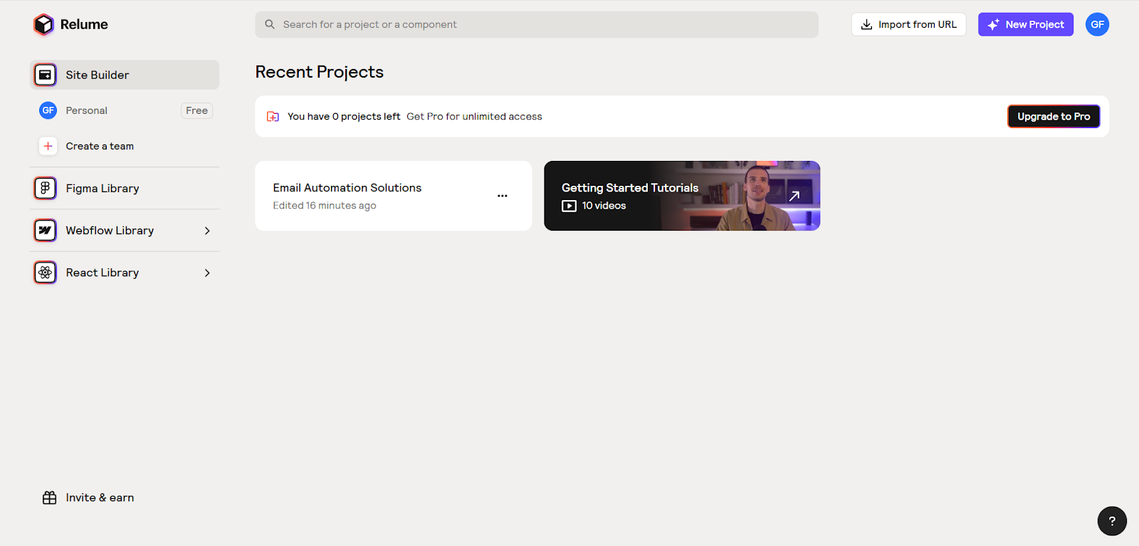 Go to Relume.io, create your account, and log in to open the dashboard. This is your starting point for launching new projects and organizing any designs you’ve previously created.