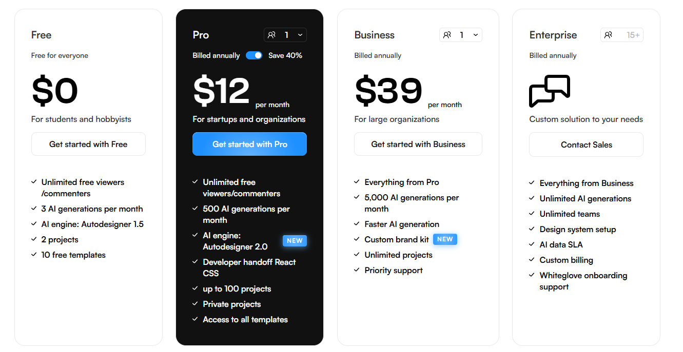 Once again, keep in mind that the free version only includes access to Autodesigner 1.5. The latest version is only available starting from the Pro plan, which costs $12 per user per month (billed annually).
