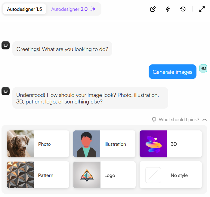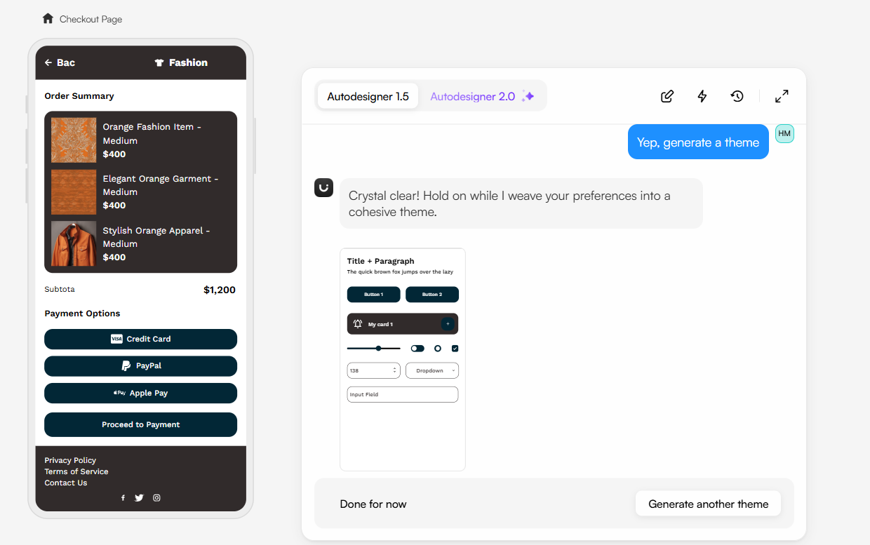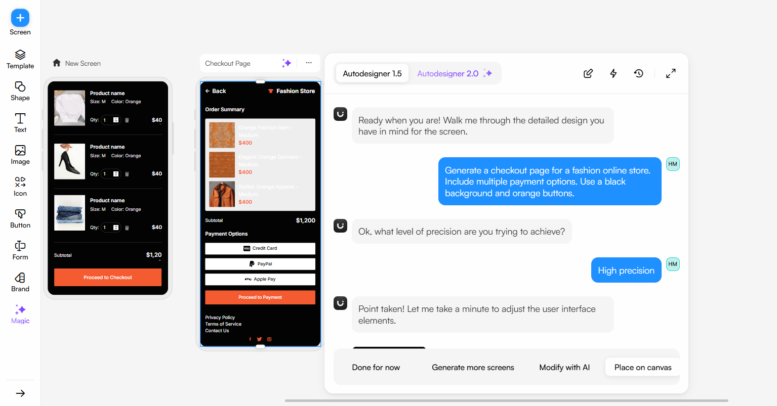 Autodesigner 2.0 includes more advanced conversational AI capabilities. You can generate individual screens and perform section edits through a conversational AI assistant.