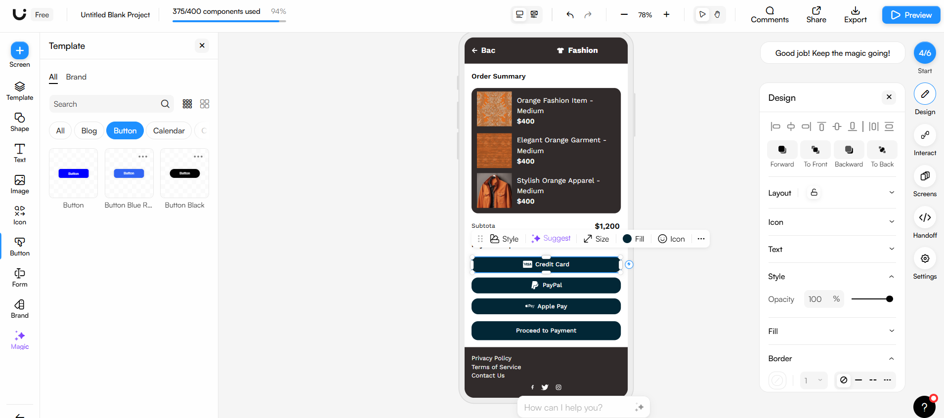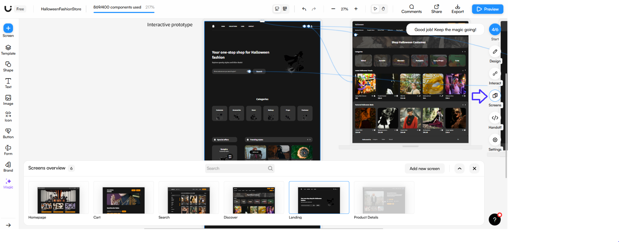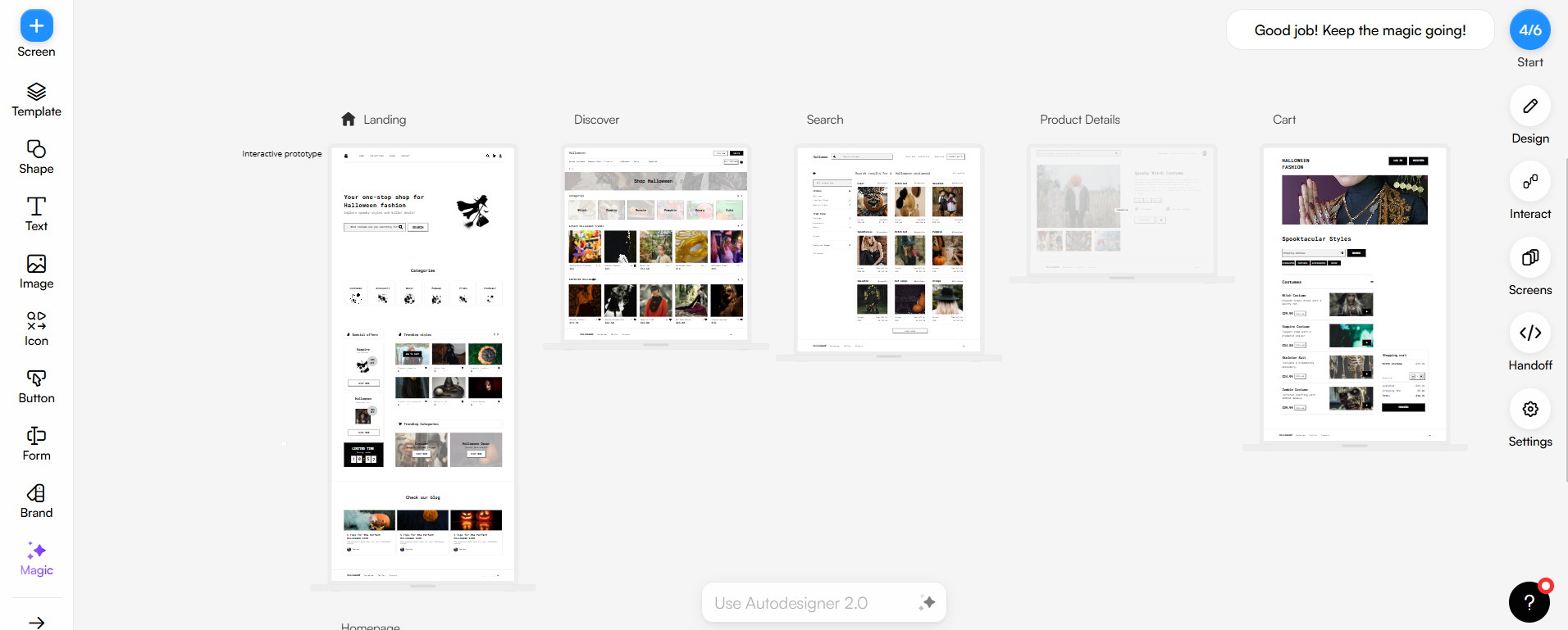 - Prototyping: Automatically create prototypes based on static designs. Turn them into screen flows with interactive elements like clickable buttons, drop-down animations, functional search bars, and more.